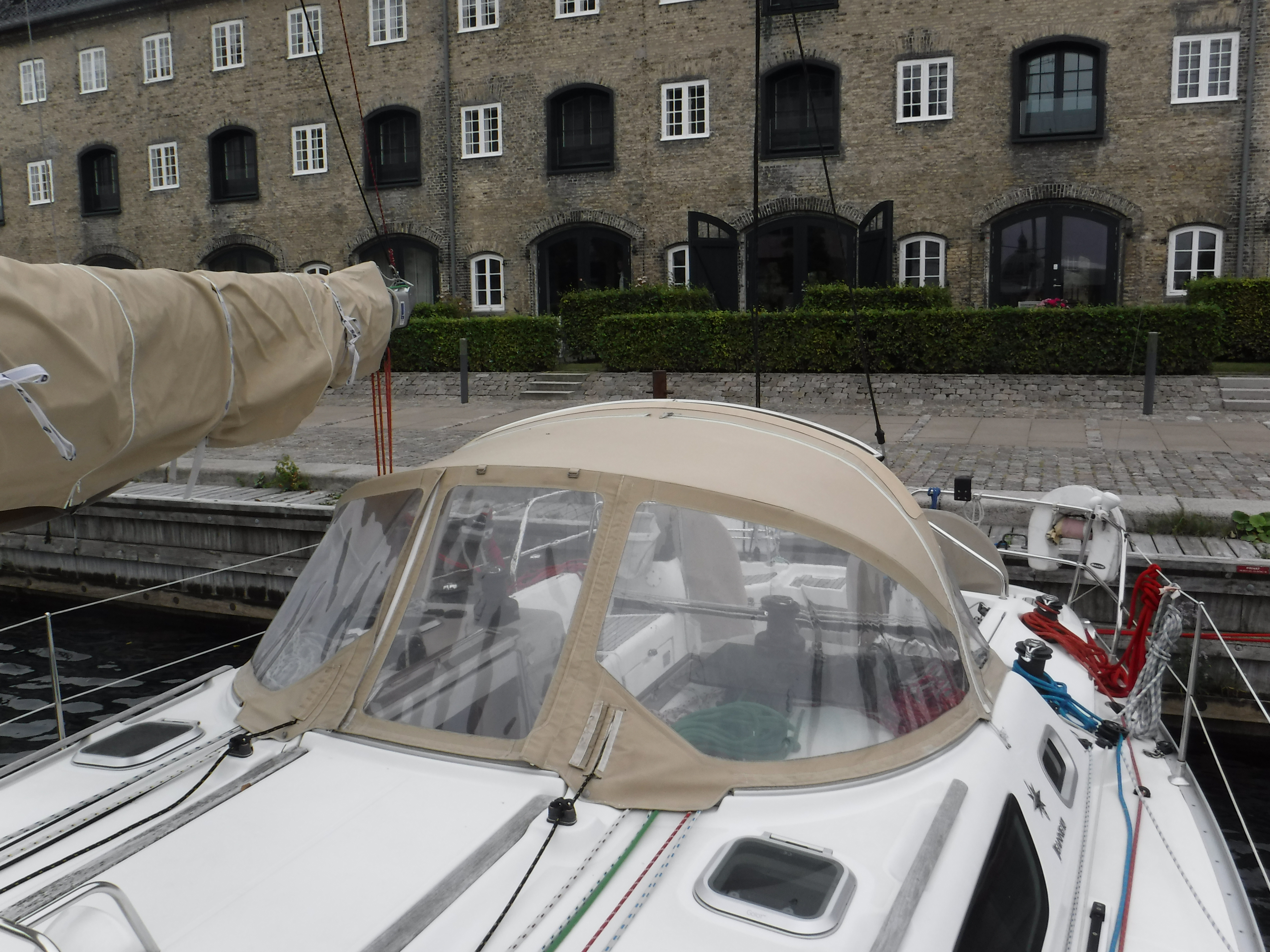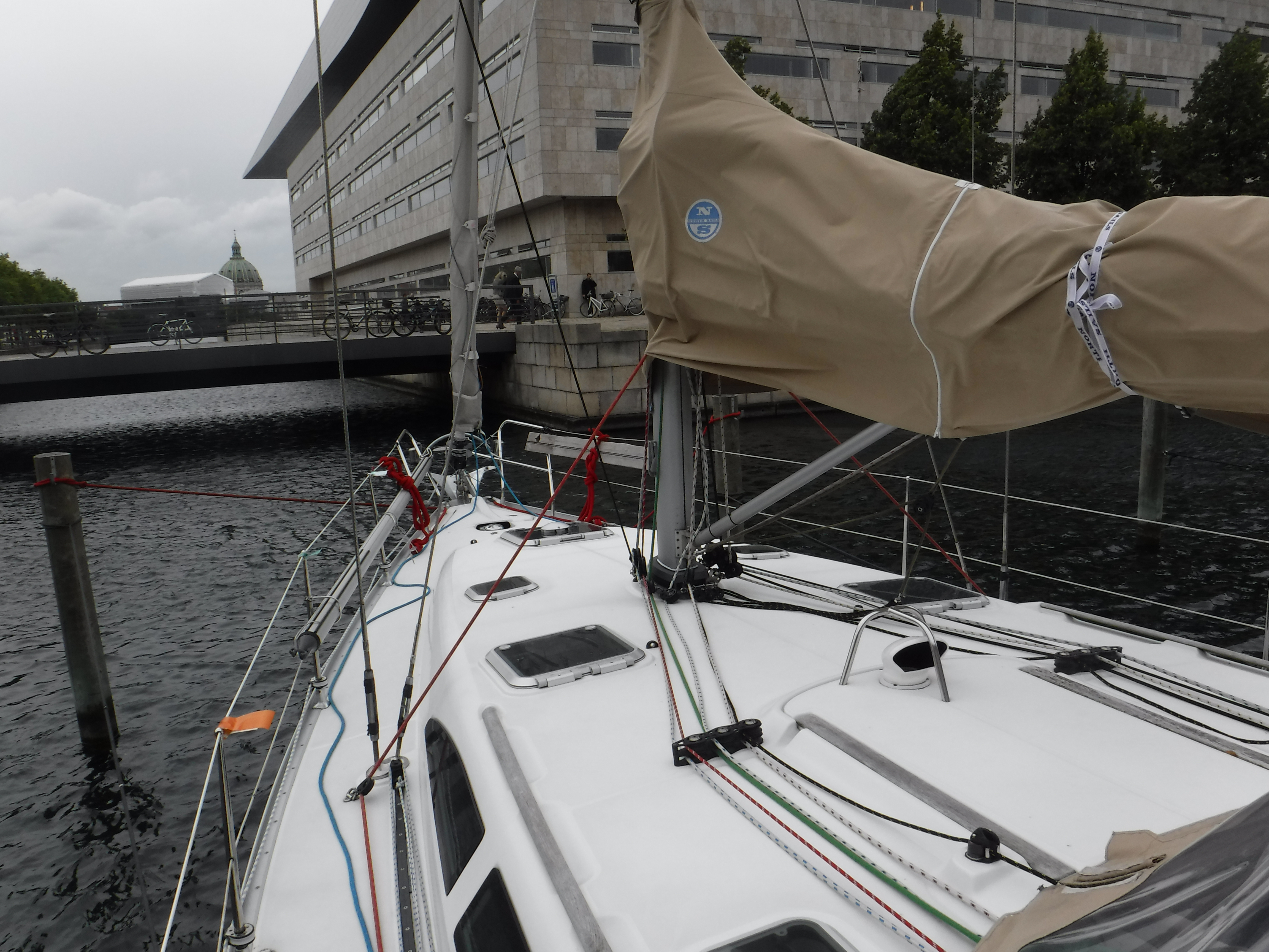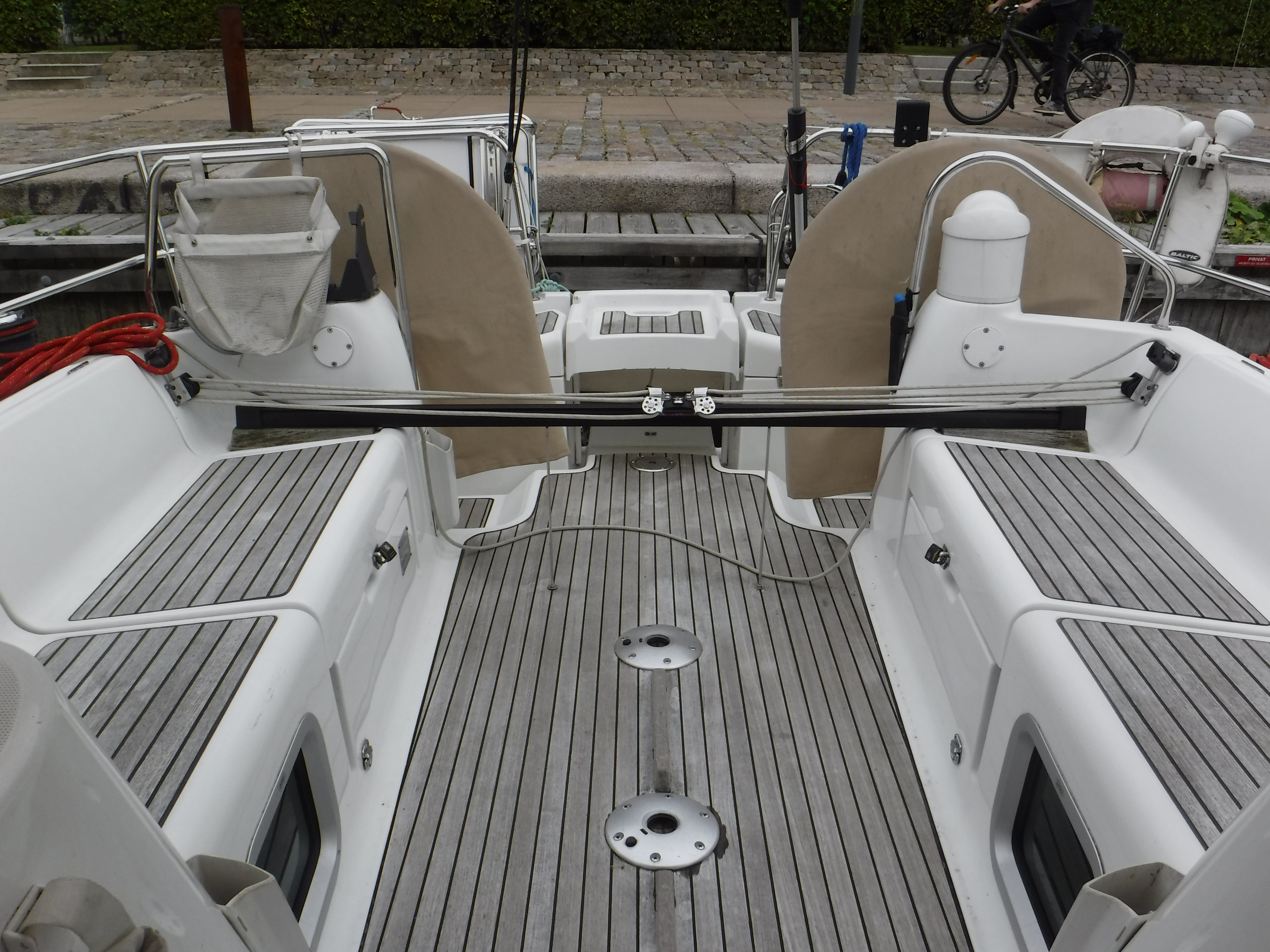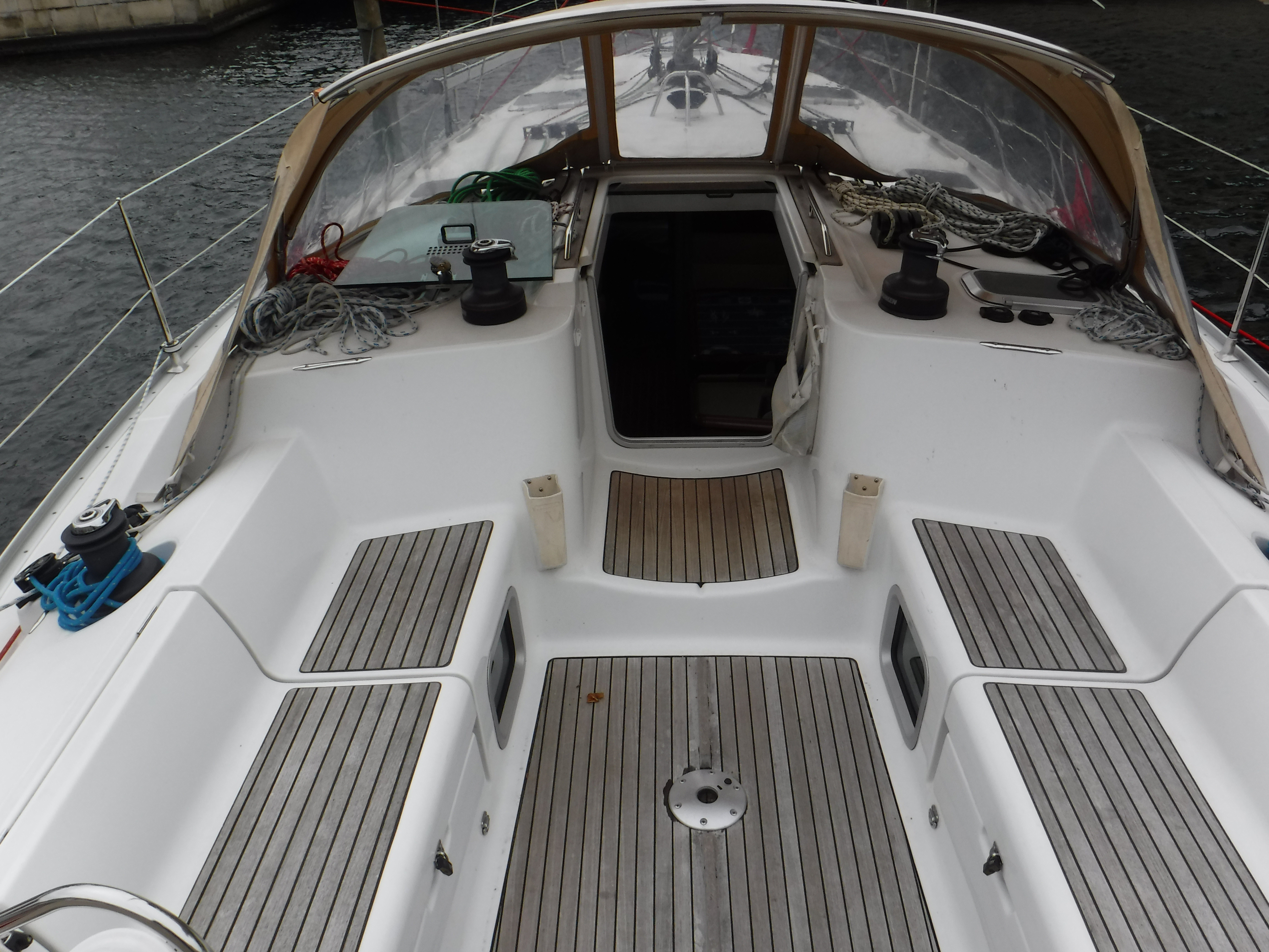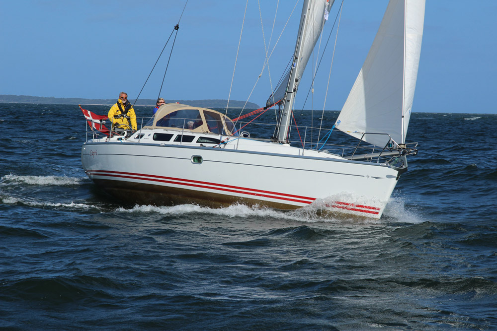 She carries a total of 924 sq. ft of sail almost equally divided between the mainsail and the genua. The mainsail is just slightly larger by 14 sq.ft.
