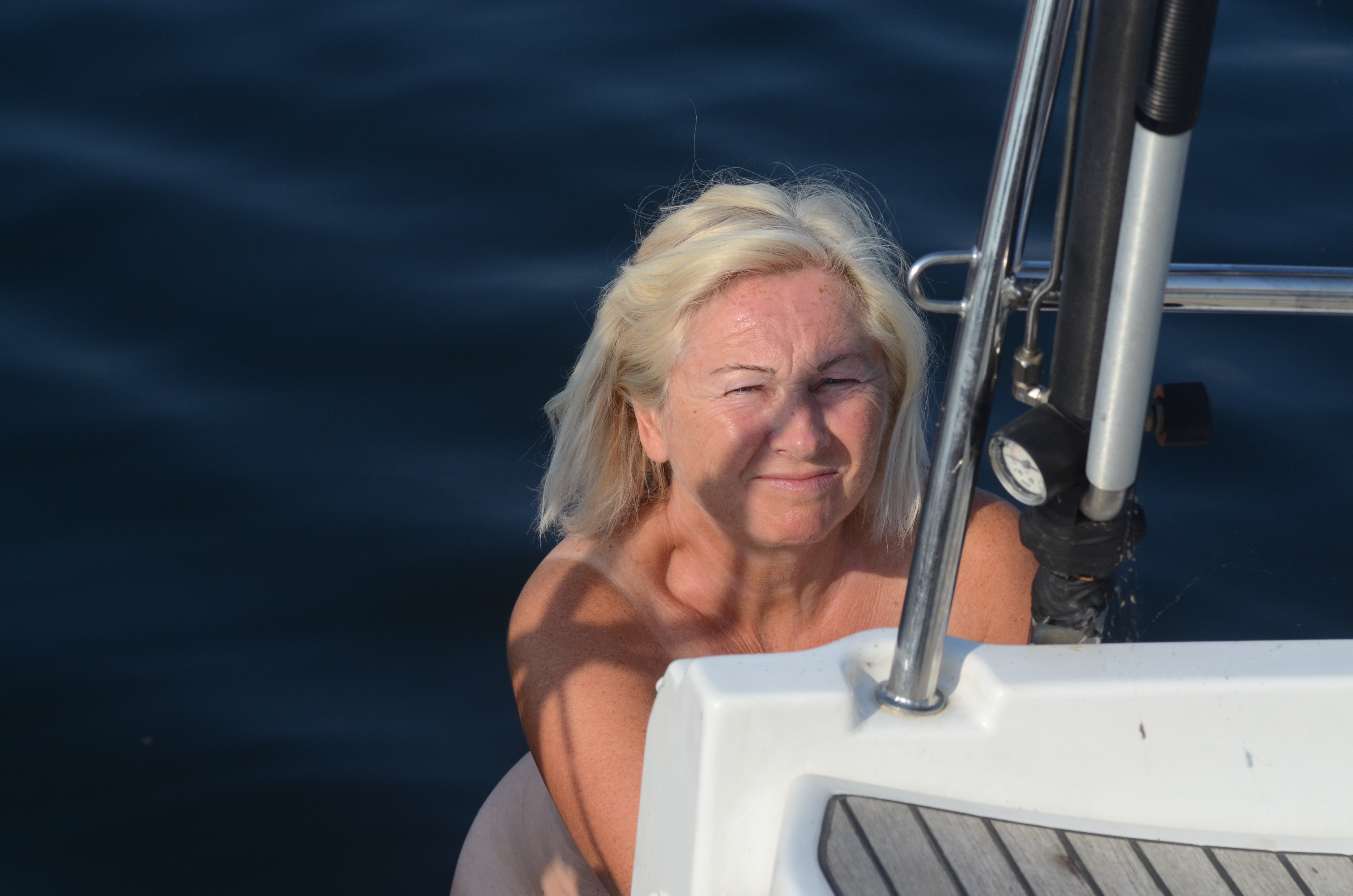 So we left Vastervik and spent the night at anchor in a small cove behind Spårø. Our first night at anchor in Capri and Vinni was nervous as hell. She claimed she didn’t sleep a wink. I wonder who the blond haired woman snoring up a storm beside me was? Maybe I should have woken her and introduced myself? Something like, “Hi – thanks for sharing my bed, my name is carsten and I have the pleasure of nuzzling up to????” Early morning (sun comes up at 2 a.m. – but we didn’t) and time for a bath. So like the swedes – jump off the back end of the boat, lather up in salt water shampoo, jump back into the water again and you are squeaky clean.