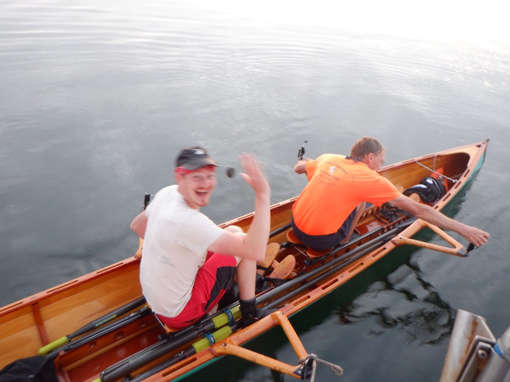 We help the two rather shocked rowers up in the cockpit. They are both very fit and obviously train every day. They told us that they used to live in Alaska and rowed there so they aren’t freezing from the (comparatively) warm water here. They declined the use of towels but gratefully accepted the offer of some warm coffee.