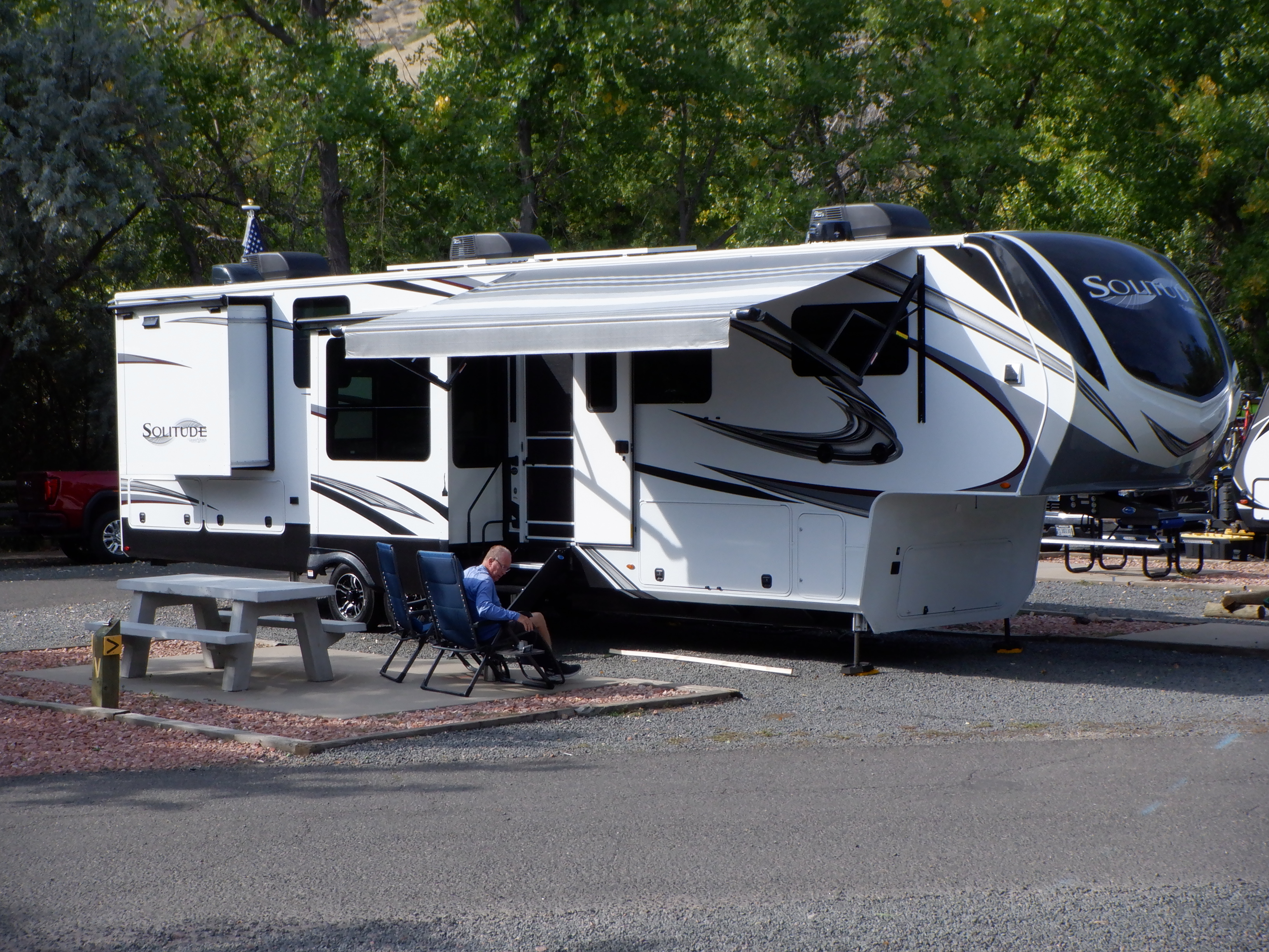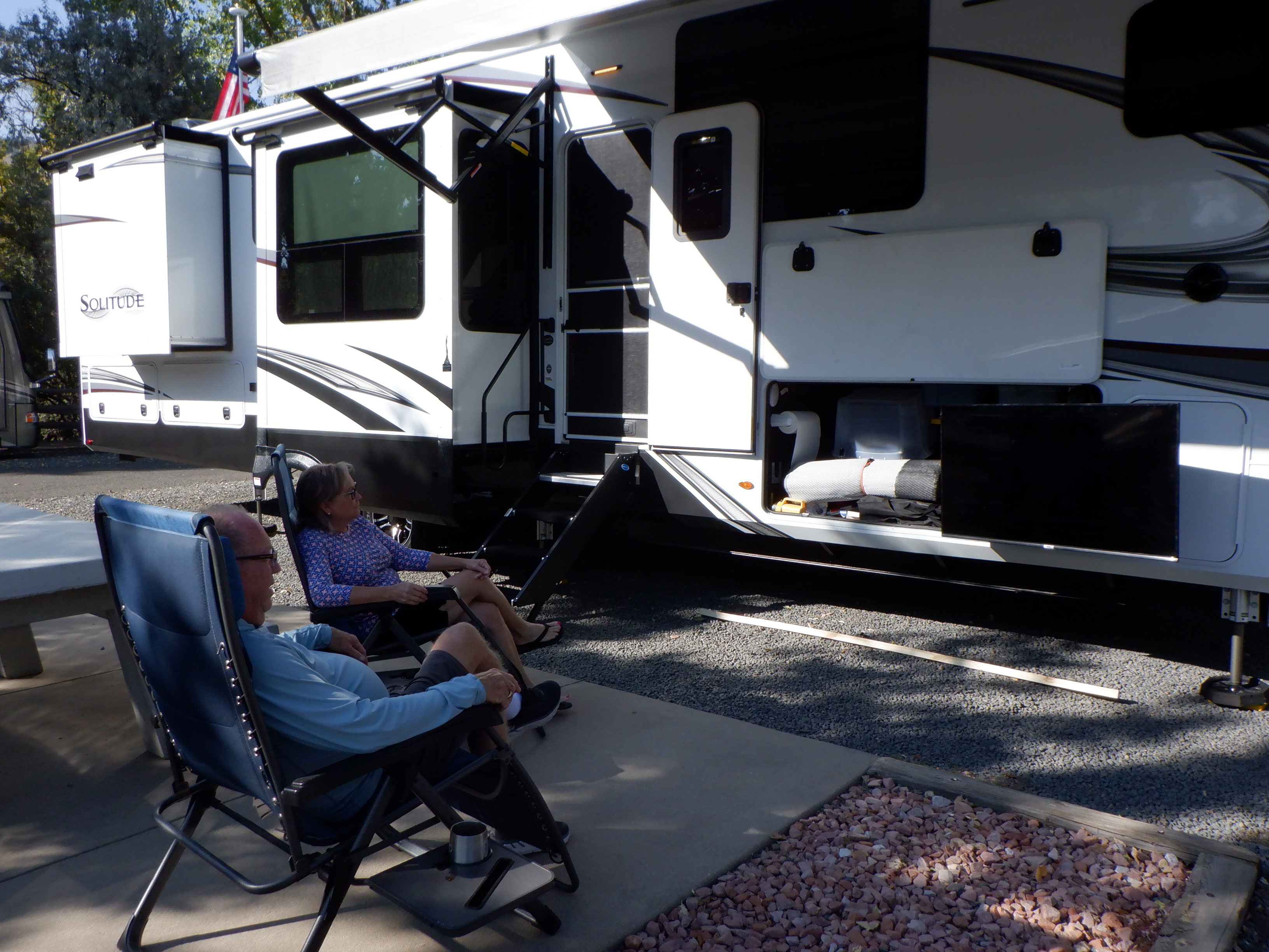 Try to imagine our antique Caprise tucked in between these gigantic trailers and motorhomes. These are everywhere in the US, but very rare in Europe since neither the roads, nor the campgrounds are big enough for them. Here you see our neighbors Keith & Ruth, who spend each morning watching the news on their outdoor TV (they one inside also) while drinking coffee.