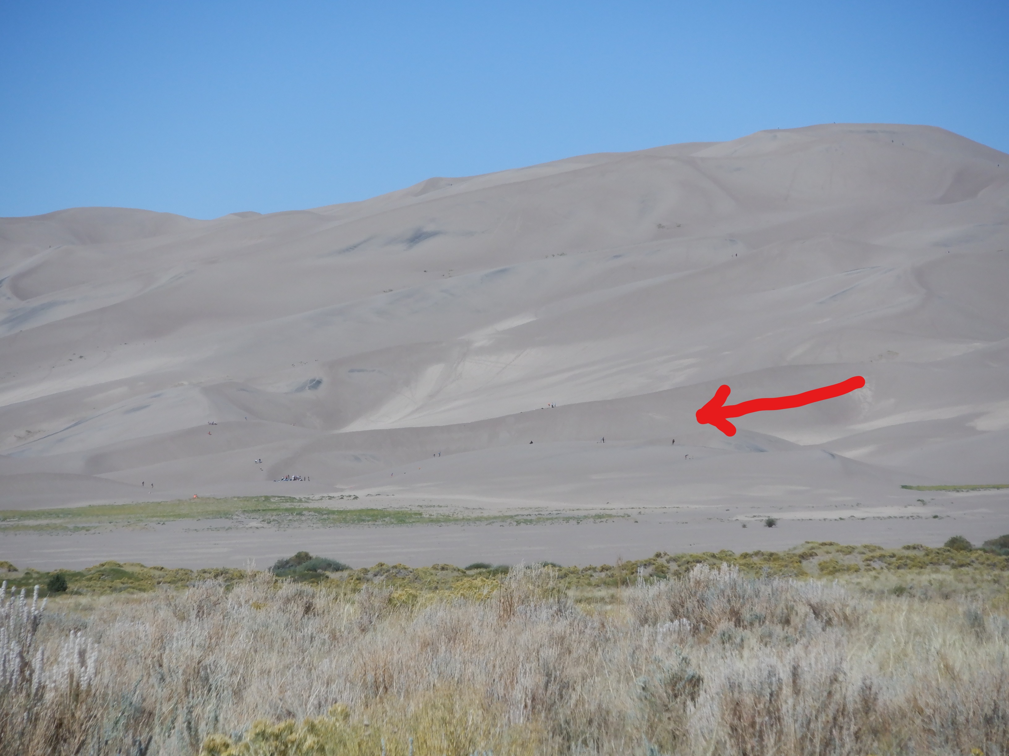 But, we had better begin at the beginning. We left Golden one fine morning after spending a couple of days at Pat and Jim’s marvelous condominium high up in the mountains. Since we want to savor our road trip, Vinni and I don’t drive on the interstate highways unless absolutely necessary. We took the old US route 285 that runs through the mountains. The next several hundred miles we drove through one National Forest after the other. Almost no one lives out here since the land is owned by the government. There are some small towns, there where the roads exit a national forest. We are driving almost directly south to visit a place called Great Sand Dunes National Park. In my hubris, I believed that I either knew the name of every National Park (there are, I believe 65 of them) or had at least heard of them. Great Sand Dunes was new to me.
