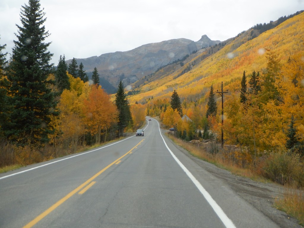 The trip, despite the bad weather (it was raining like mad) was unbelievably beautiful (there are those adjectives again). The Aspen trees were showing their gorgeous fall colors, brilliant yellows and reds. The mountainsides looked like they were aflame. The panoramas were indescribable. As we’ve said, we have run out of superlatives. There is an expression; “drop dead view” and that certainly best describes this. I doubt it is possible to find panoramas like this anywhere else.