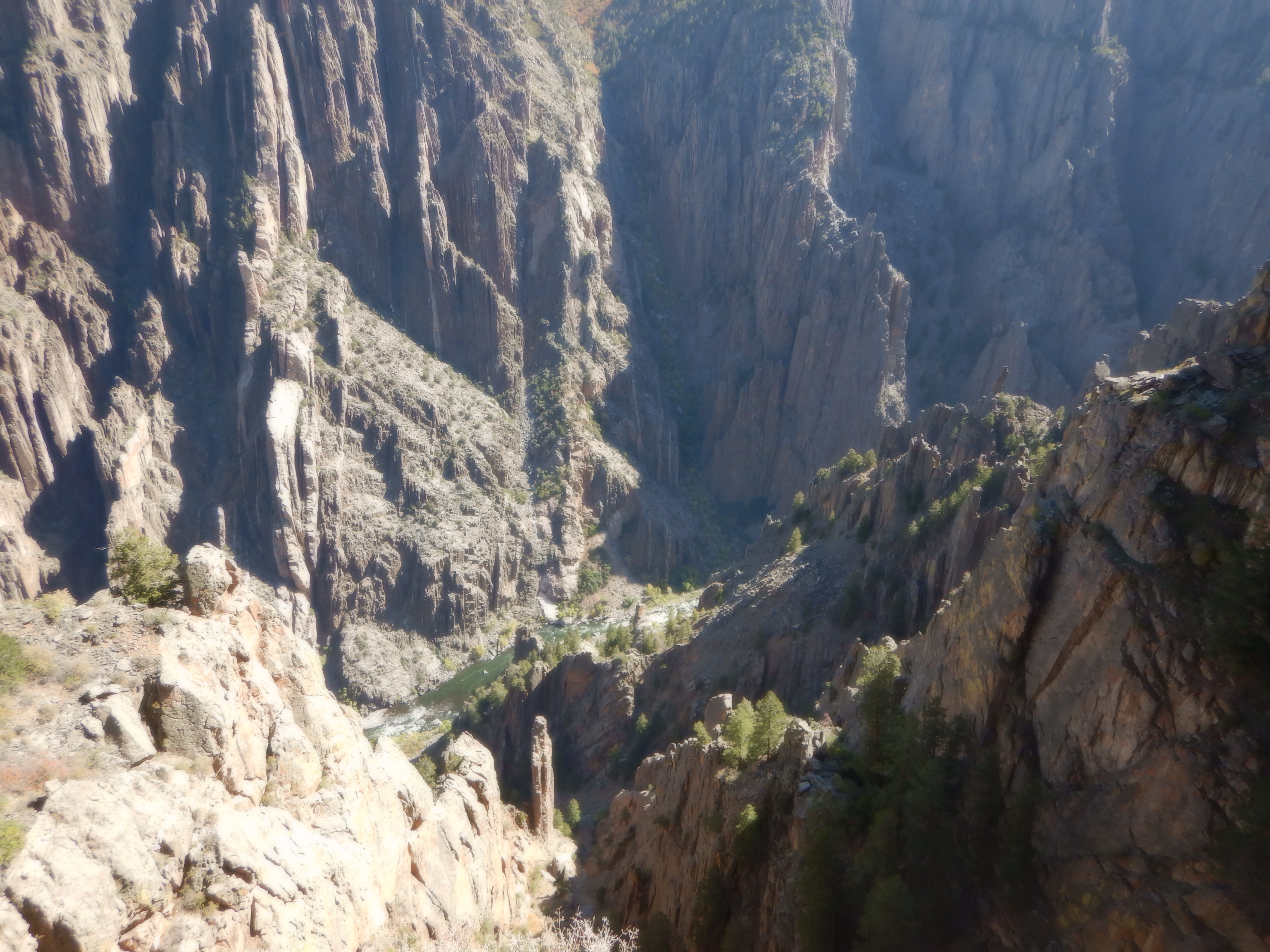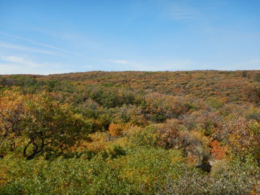 From the top of the cleft, you can hear the river roar at the bottom. It is a constant background noise. There are 11 viewpoints along the 15 mile “scenic road” that runs along the south rim. Each viewpoint is filled with “aha” experiences. If you suffer from vertigo or fear of heights, this is a bad place to go. There are a few safety fences here and there, but for the most part, you are simply standing on the rocks at the edge of the cliff. It is a loooong way down. Everywhere along the rim, the Gambel oak trees, only 3-4 feet high have clothed themselves in their autumn colors. The hills are an explosion of reds, greens, oranges and browns. Beautiful.