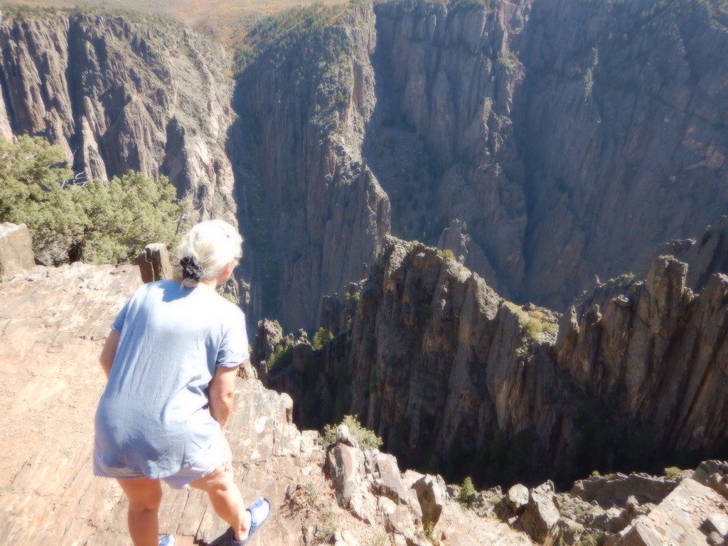 As I noted above, over the years I have entertained Vinni many times with stories about the Black Canyon and as we leave early the next morning for the 45-minute drive, I begin to get nervous. After all, it has been more than 50 years since I saw it. Will it live up to my (and Vinni’s) expectations? Have I “oversold” it? The narrow asphalt road winds its way up the mountainside to the park. Once again, it is free for old farts like me (Vinni is not an old fart) to enter and a kilometer from the park entrance we come to the first viewpoint. We park Caprise and wander towards the edge of the canyon and the viewpoint.
