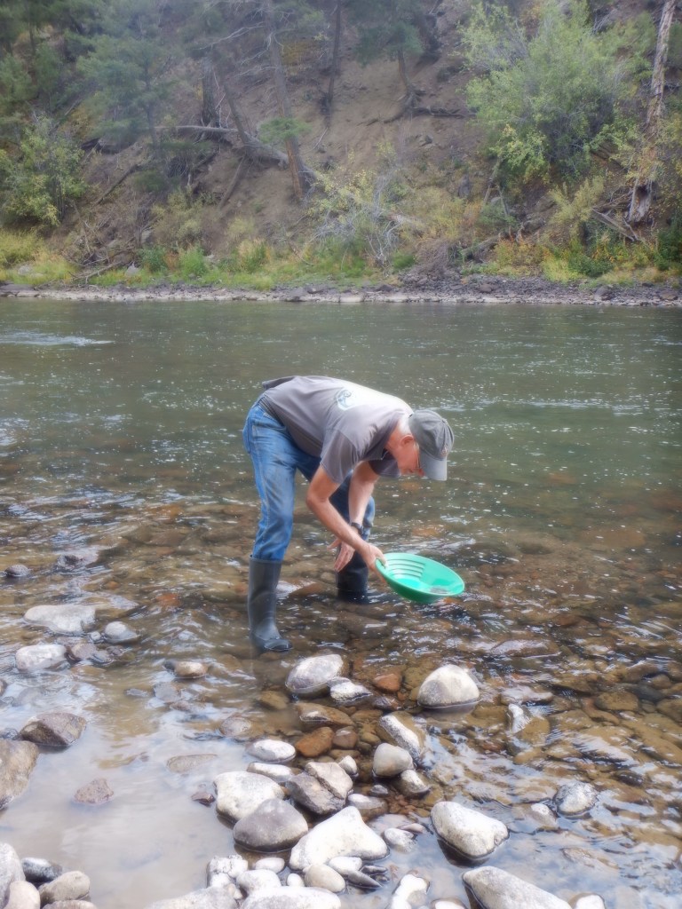 It is here, in this campground, that Vinni has one of life’s unforgettable moments. We see a fellow down by the river, bent over studying something. “What do you suppose he is doing?” she asks. “he’s not fishing”. I look and say, “I’d guess he’s panning for gold”. “What?!! Panning for gold? You’ve got to be kidding!!” Vinni grabs the camera and rushes down to the river. It turns out that the man IS panning for gold. The fish aren’t biting so he might as well do something useful. After all, a nugget might just show up in the pan. Vinni has never seen anyone pan for gold; she thought this was something that people did a couple of hundred years ago.