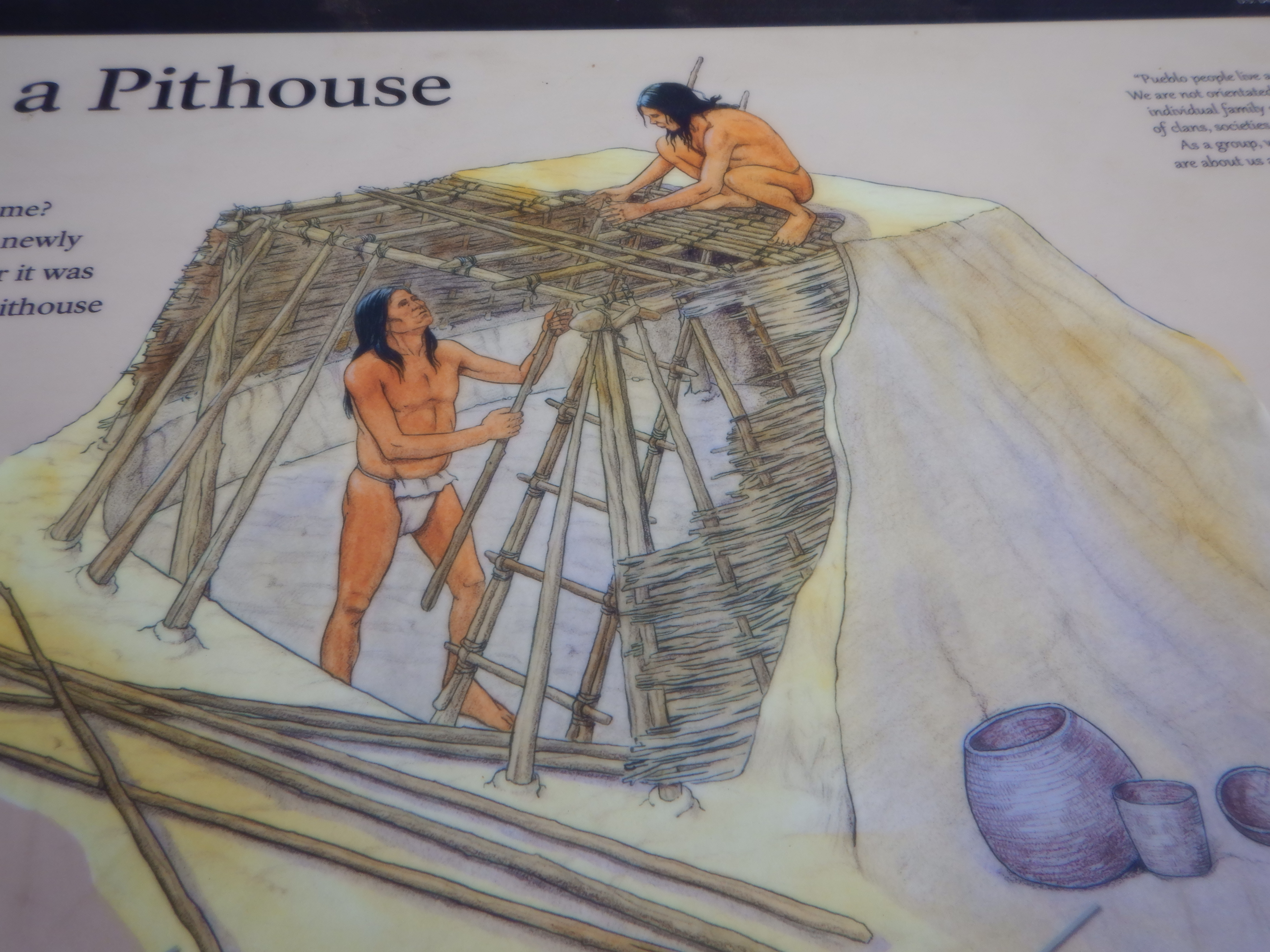 The first Pueblo Indians arrived around 550 AD and built pit-houses on top of the plateau and amongst the cliffs. A pit-house is partially underground. The builders dug a square hole 9 x9 feet and 3-4 feet deep and erected poles in each of the 4 corners. The corner posts carried the roof construction, which consisted smaller poles covered with branches and finally topped with a mixture of clay/mud/leaves, which, when dry, became watertight. Today we know this clay mixture as adobe. The Pueblos were not metalworkers. Their tools were formed from stone, bone and wood. Stone axes were used to cut trees and form the 30-odd poles needed for a pit-house.