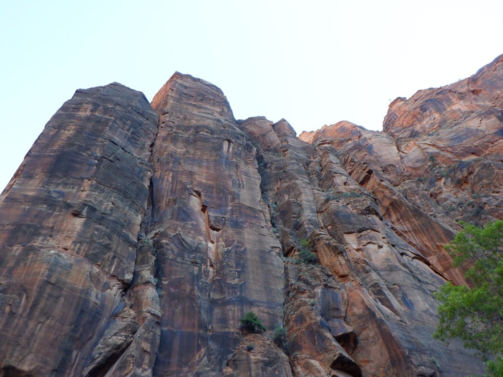 Once away from the bus stop, we had the world to ourselves. The canyon here is narrow and the cliffs vertical. The rocks are a fantastic red color and rise several hundred meters above our heads. Water in the river gurgles over small rocks alongside us. Small reptiles scurry under the bushes, hiding from us as we come tramping. Chipmunks are everywhere, running about in their eternal search for food.