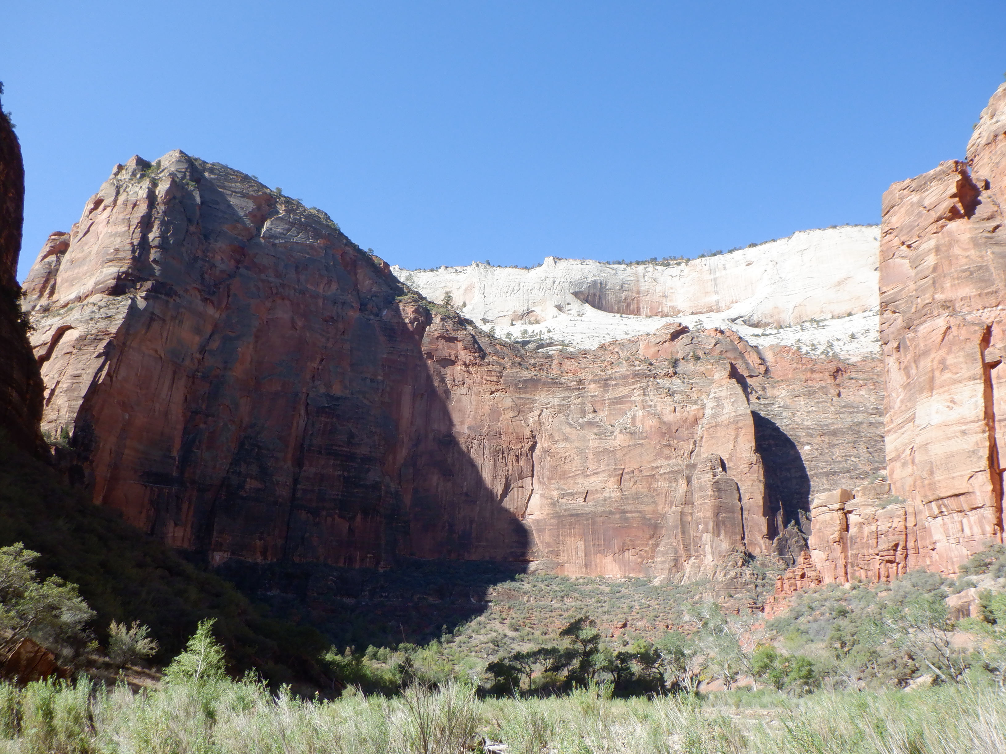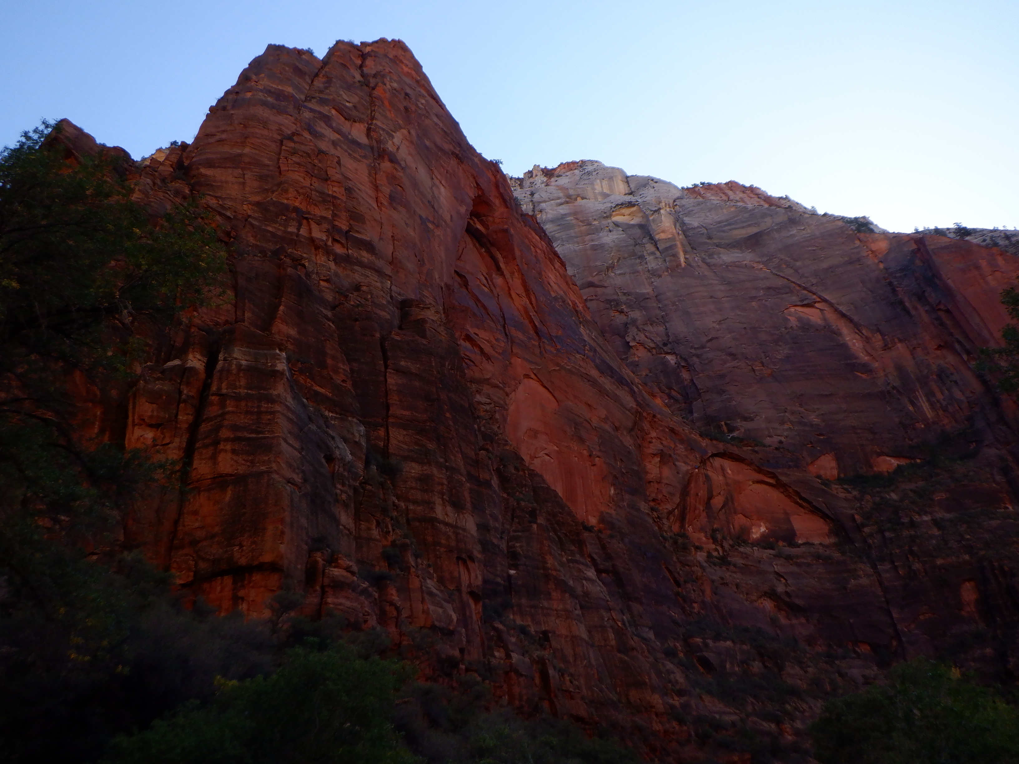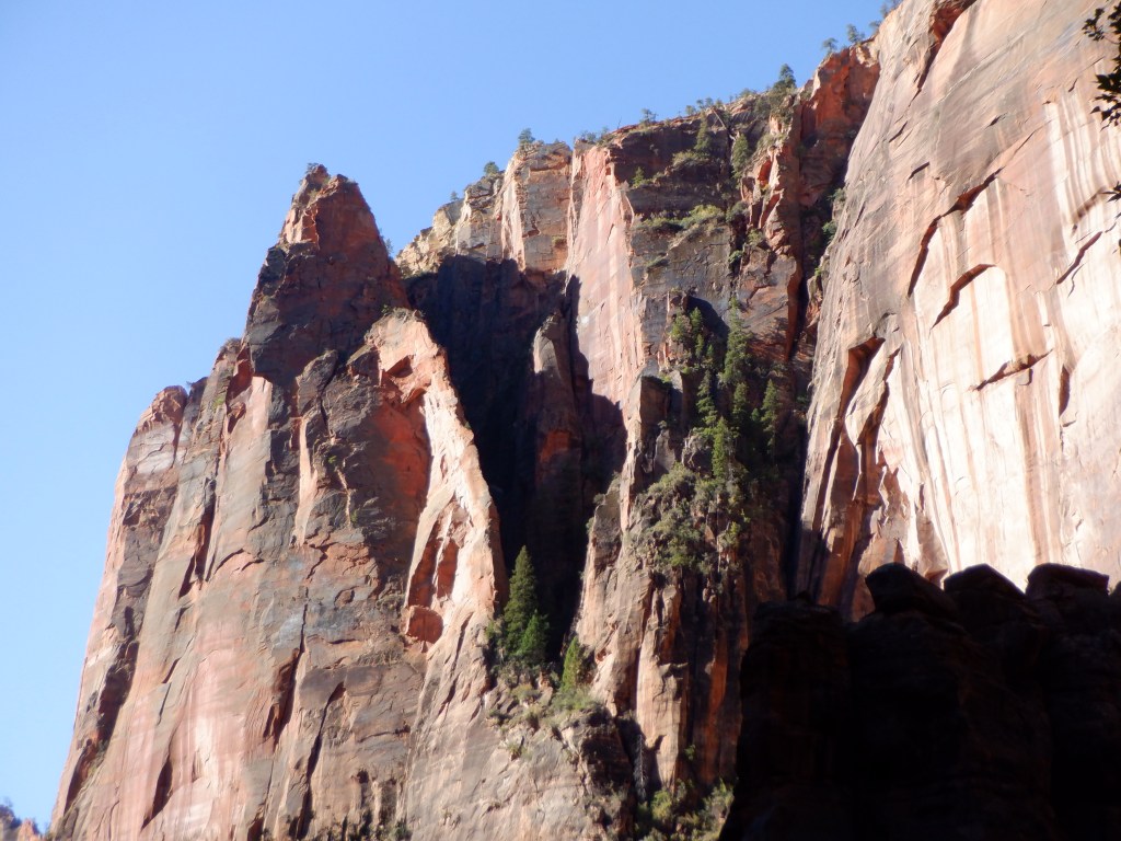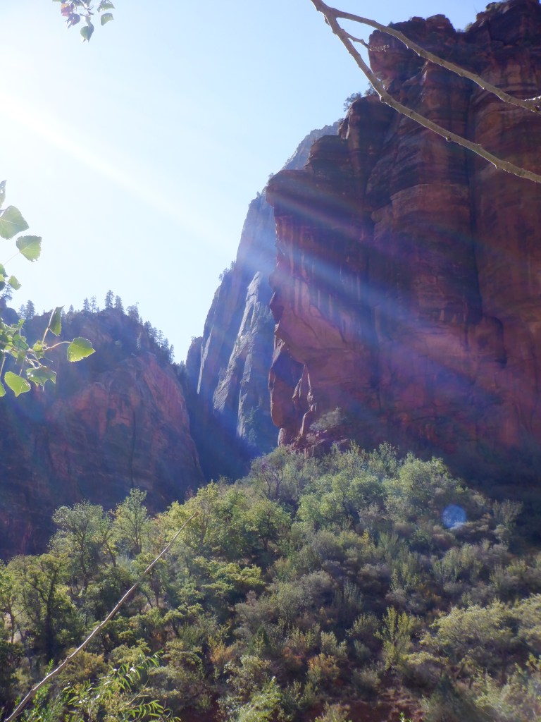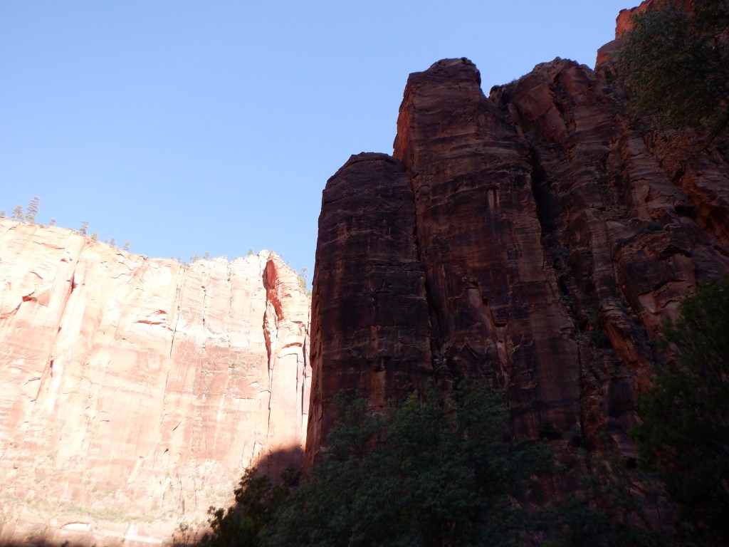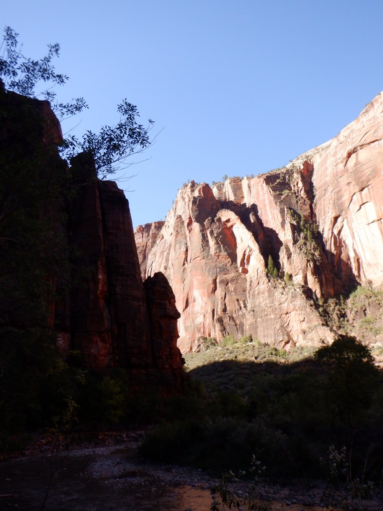 It is cold. We are at over 7000 feet and the sun comes late into the bottom of the canyon. You feel very, very small when you walk here. IT feels like walking in a cathedral. The silence is only broken by the gurgle of the water. We pass several small waterfalls where tiny brooks wind their way the cliffs. When a bus passes up on the road, it feels like we are being invaded.