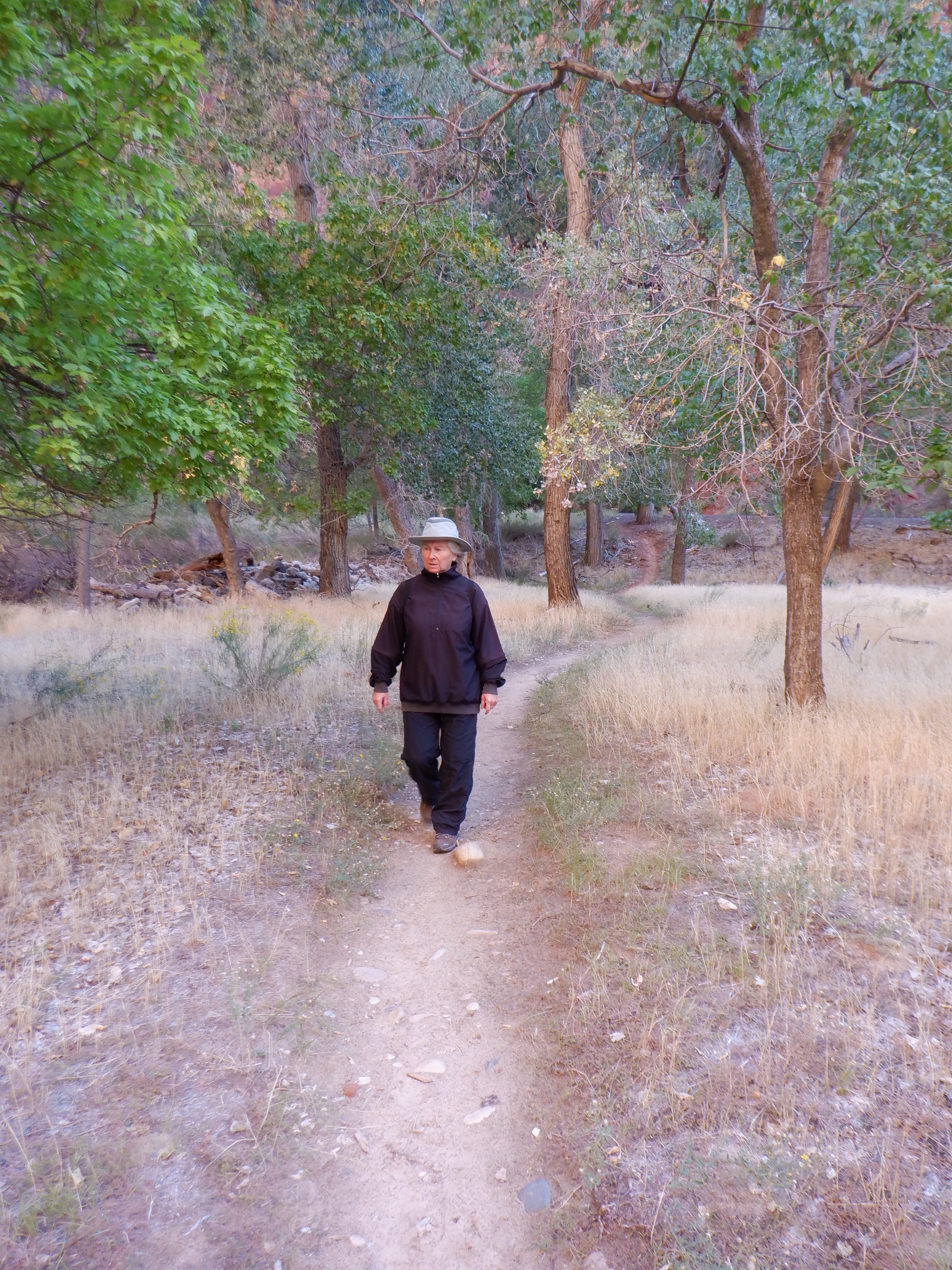 The sun begins to reach down and spread warmth here where we walk. It feels wonderful on our shoulders. We look forward and can see the narrow canyon widening further on.