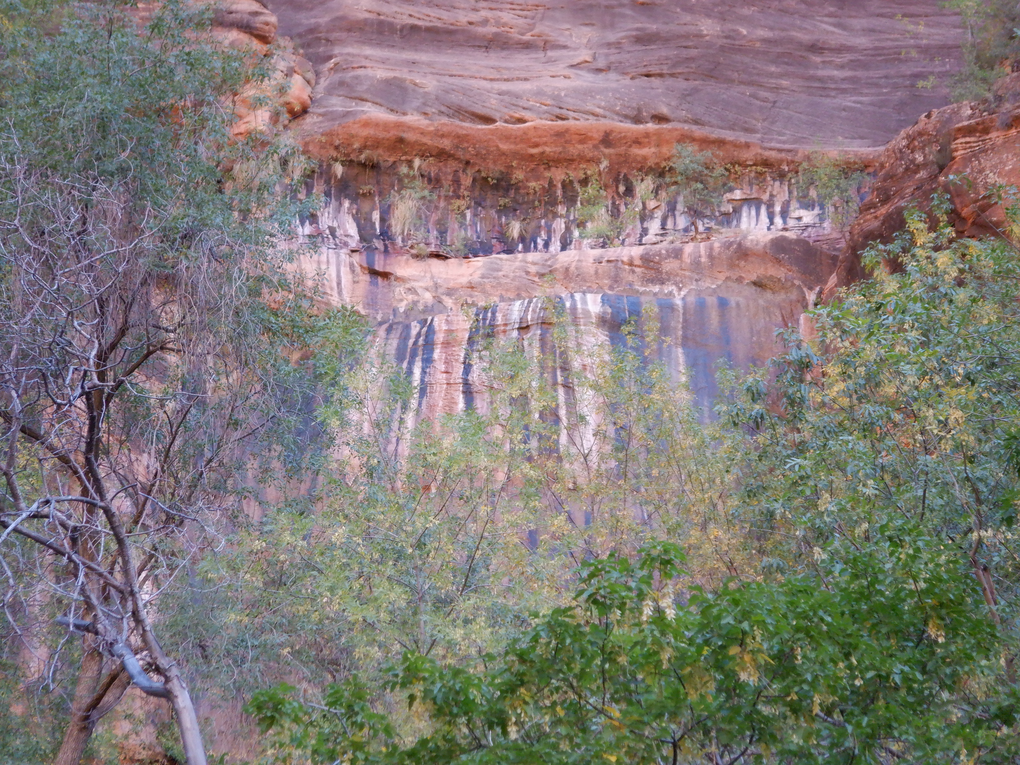 We see one of the well-known “weeping springs”, there where water is seeping out through a crack in the cliff. This one has colored the cliff in a many-hued fan of stripes. Wonderful.
