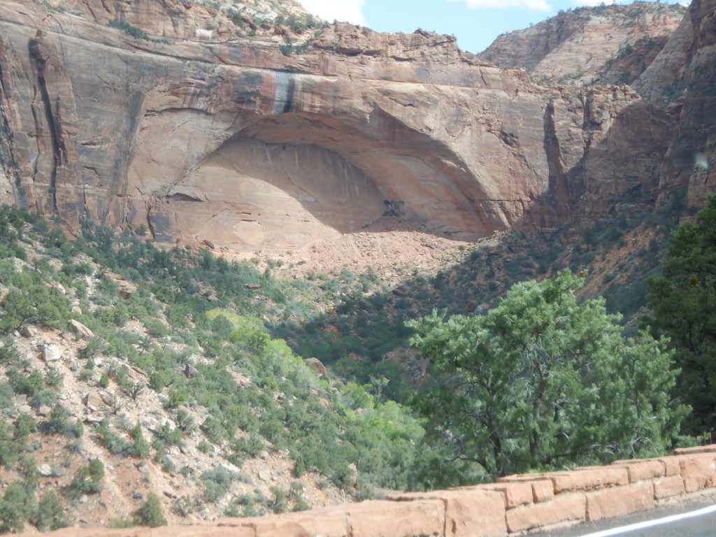 They take no chances here – if you say you are going east, they measure you before you enter the park. We drive up the mountain, and drive further up the mountain – the road gets narrower and narrower, lots of traffic – we’re not the only ones who want to exit through the eastern side. The panoramas are magnificent; we utter one “Aha” after the other. Suddenly the traffic stops and we are in a que. There is a que every time a vehicle like Caprise comes along – then the tunnel becomes one-way until they have passed through. We wait and finally it is our turn. There is a Ranger standing alongside the road, who stops us and says, “Stay in the middle, do not try to drive in one lane or the other”. Since we have no wish to rip the roof off Caprise, we drive with the middle yellow lines firmly planted in the middle of Caprise. Meanwhile, the traffic coming the other way waits patiently.