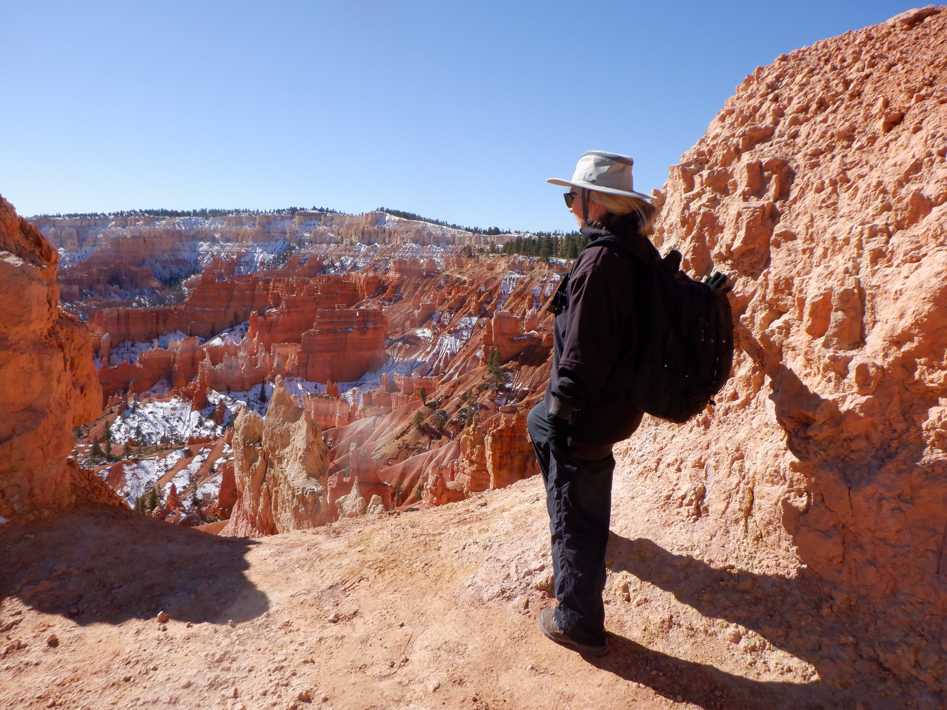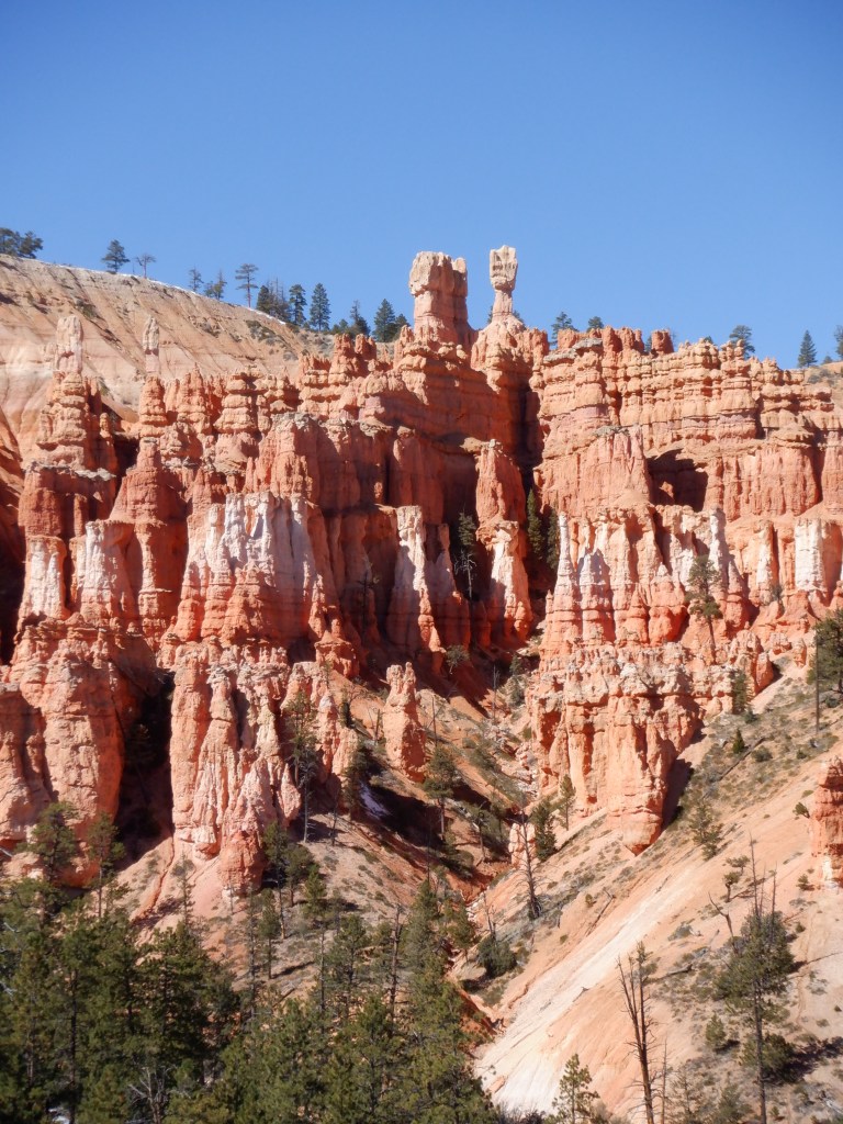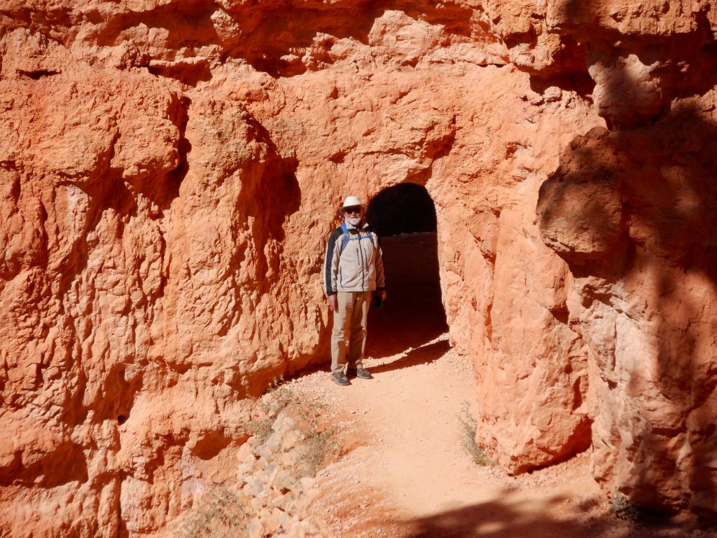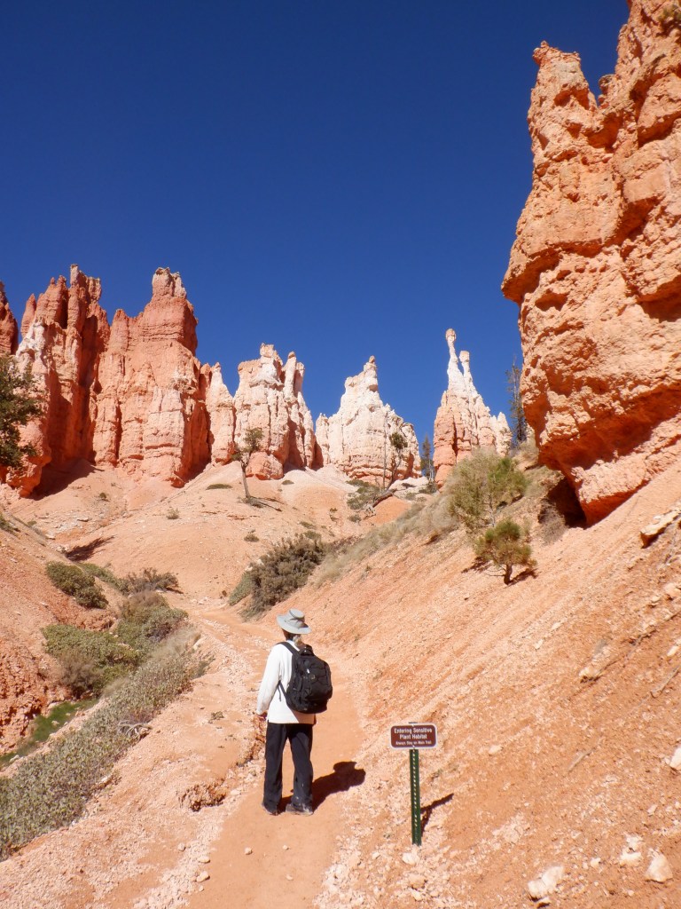 After parking Caprise, we grab the shuttle and get off at Sunrise Point. One of the trails, Queen’s Garden has its trailhead here. We stand and gawk at the scenery. We visited Bryce many years ago with my bother Carl – but memories fade and we have forgotten how unique this really is.