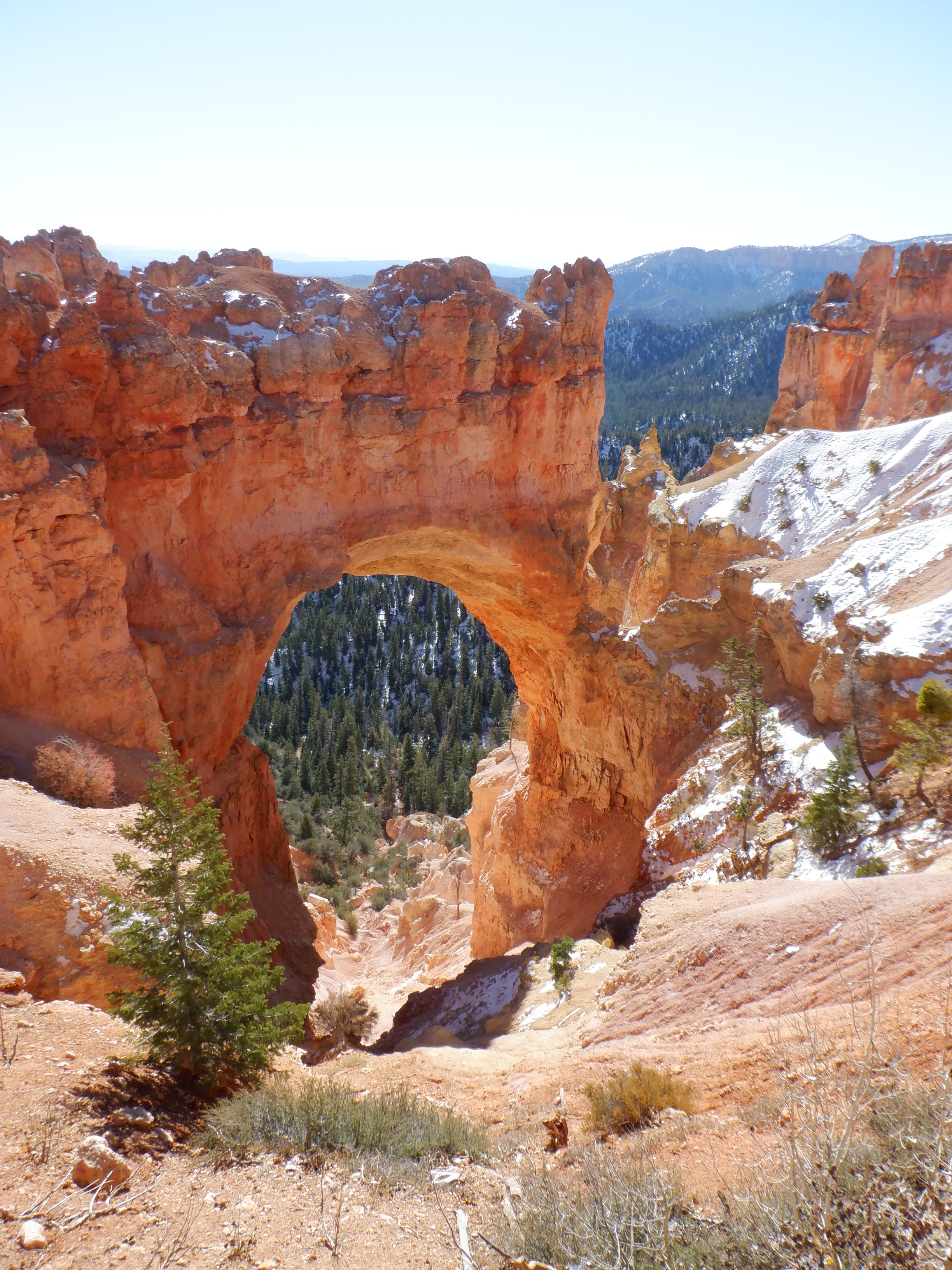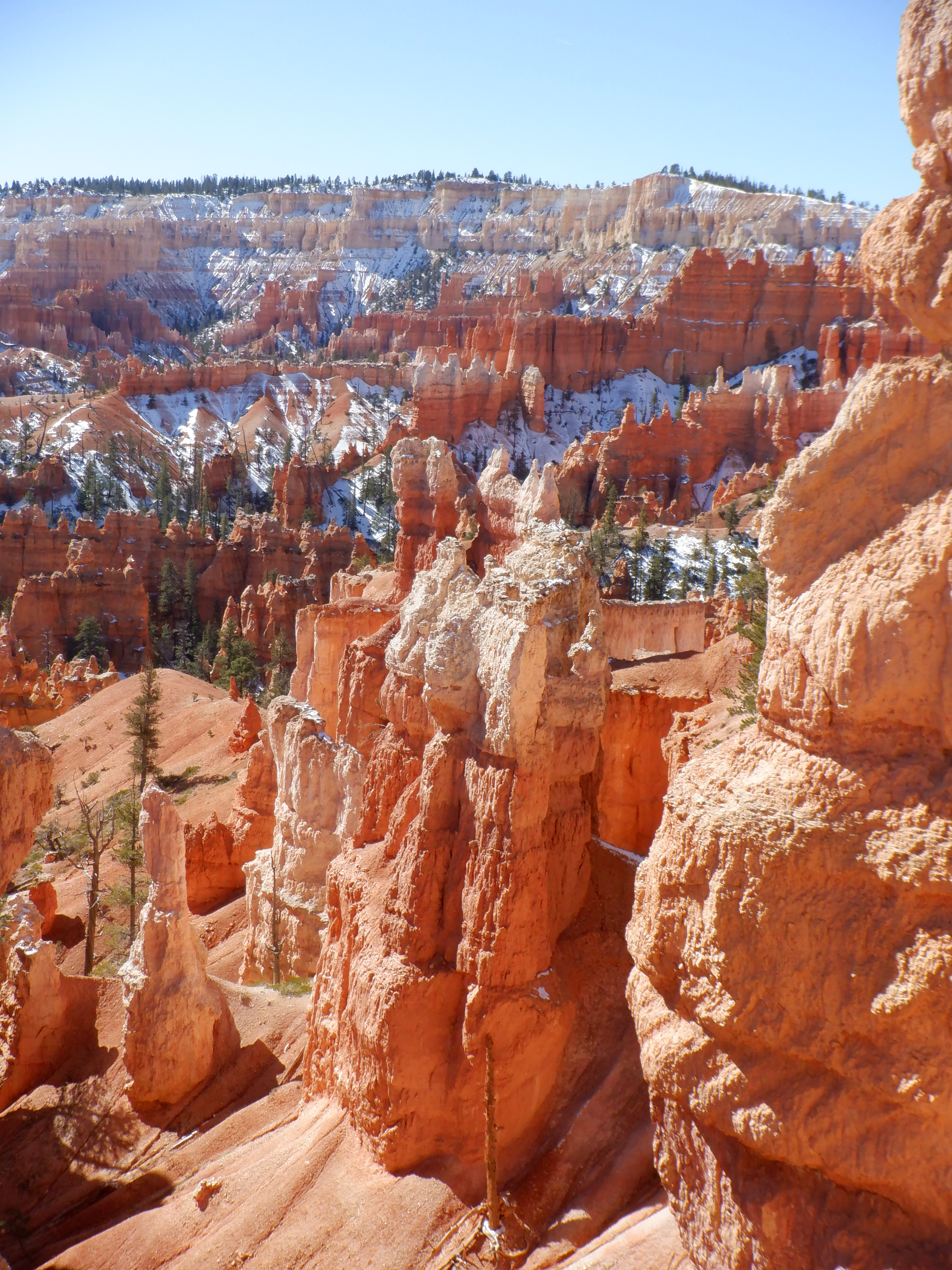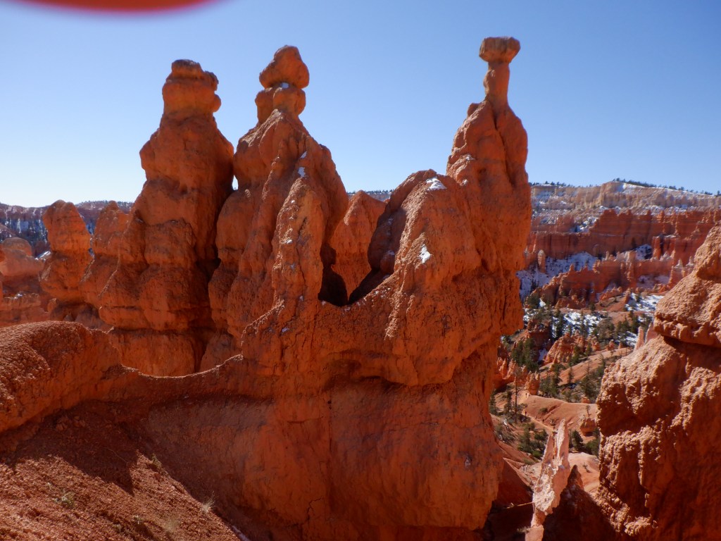The first few hundred meters is a quiet walk through the pine forests at the base of the canyon, then the trail splits. Here we turned right to start the counterclockwise trek. The trail immediately became steep, wound its way around rock formations and became steeper. Then even more steep. All around us the Hoodoos rise. Hoodoos are the name for these unbelievable spire-like rock formations. The trial is truly steep now. It is narrow and there are many places where the sun doesn’t reach. The trail is covered in snow and ice, the hairpin turns are dangerous to negotiate. It is a looong way down. We pant and try to get air. We are over 8000 feet and the air is thin up here – very thin. We are not used to this thin air – especially not used to exerting ourselves in something like this. We take frequent pauses. Even with the frequent pauses we quickly begin to feel it in our leg muscles. Our lack of oxygen is reaching our muscles. We pant and blow some more. I’m more affected than Vinni – but she also feels it. We meet no one (no one else is crazy enough to be doing this). The very few we meet are having just as hard of a time as we are.