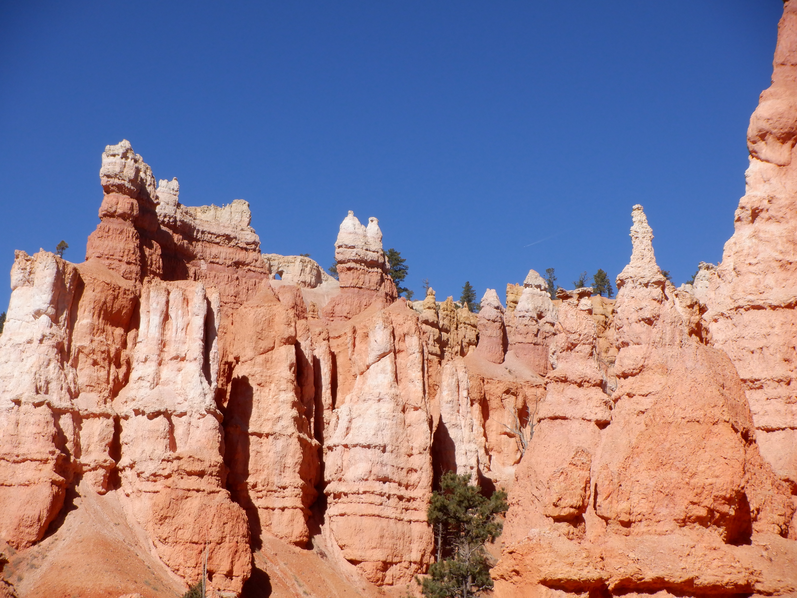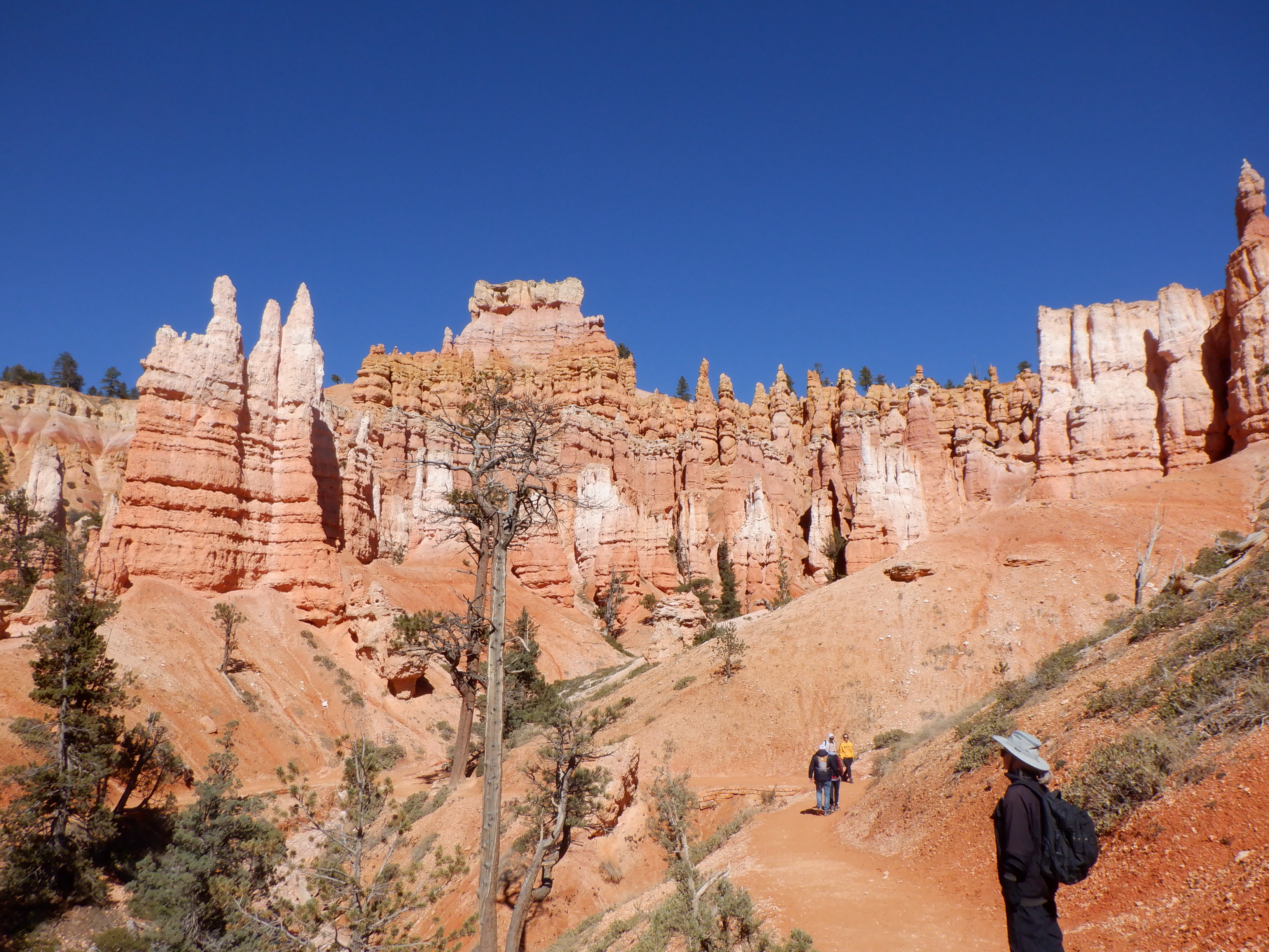 Each mountaintop we climb over exposes a new panorama. We take pictures and videos right and left. They say a picture is worth a thousand words. I hope so. I wish we were poets so we could do justice to this. Hoodoos tower up around us. We look across the valley at the wall opposite. The Hoodoos there look like a gigantic pipe organ. Colors fade from deep red over to pink to white. We can’t internalize all this. Our senses are overly sated and can’t digest more. We end up just standing, panting and staring at these wonders in silence.