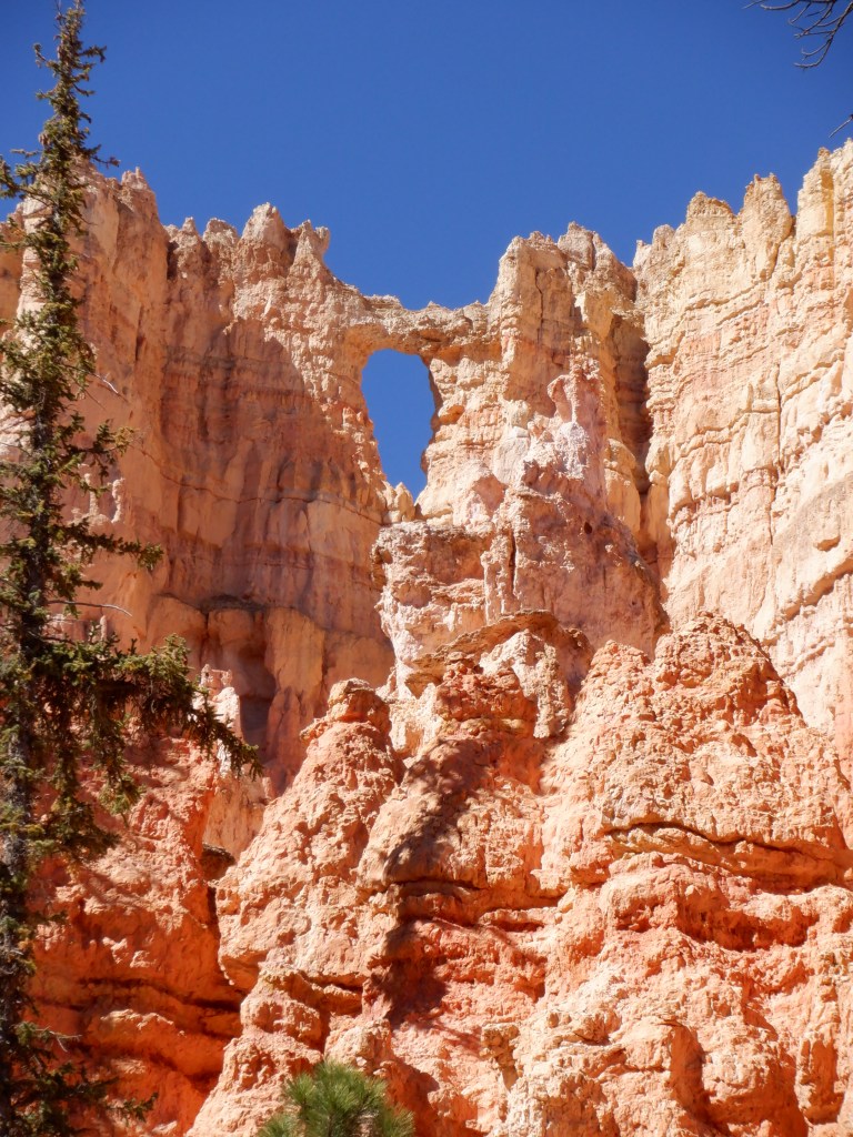 Vinni and I start down Queen’s Garden trail. A round trip is 2-3 miles. At the bottom, the trail meets Navajo Loop Trail and one can use that to come back up. The trip down is fine – we get a bit breathless on the way, since the trail goes both down and up – but the up portions are small and not too steep. The stone formations and the view is, as noted, indescribable. We stop saying “aha”. It ceases to matter. Despite our being very early, the trail is filled with hikers. We don’t have the same peaceful wandering we had in the Canyonlands.