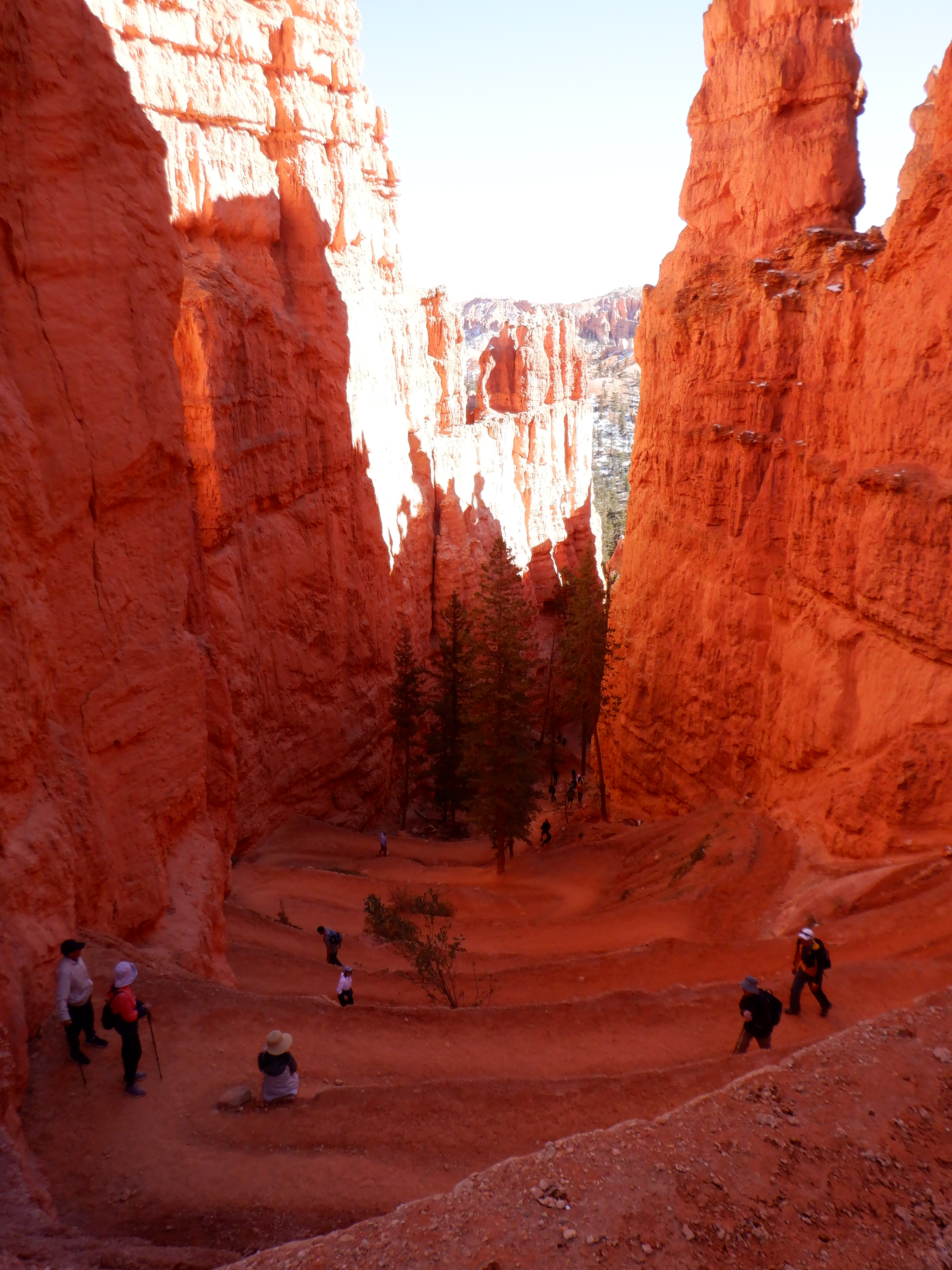 WE drink water like mad – even though it is cold – we’re sweating like pigs. After some more tortuous hours, we are back at the end of Queen’s Garden Trail. Here we can choose – back up Queen’s Garden, 1.5 miles or the short Navajo Loop Trial – “only” 0.6 miles. We have to go up just over 600 meters (0.4 miles), so taking the Navajo Trail means that we’ll be going up almost 1 meter for each meter we go forward.