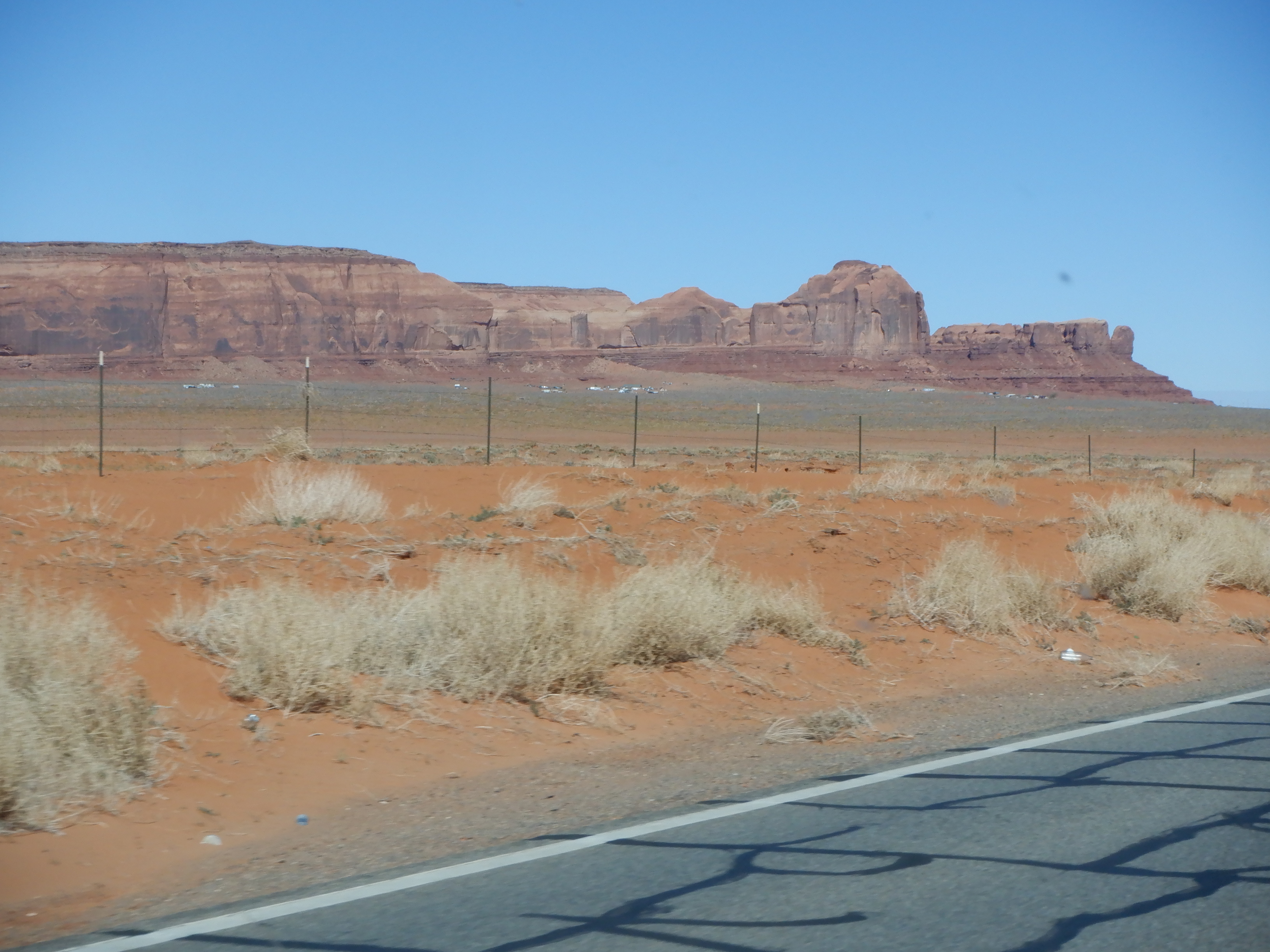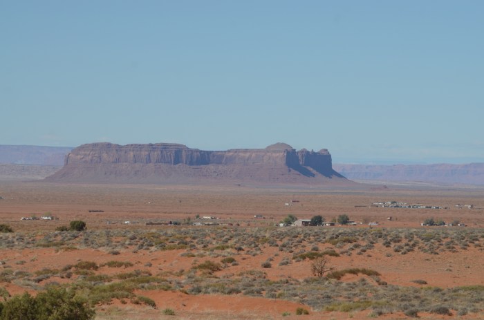 After several hours of driving and seeing literally nothing but desert, we finally pass through Kayente. We are now halfway to Monument Valley. In Kayente the houses are exactly alike, the only difference is the color of the roofs so the inhabitants can find their house. The houses are typical prefabricated houses, boring and probably built by the federal government in the latter part of the 60’s or early 70’s. The Black Power movement in the 60’s and 70’s also served as a wake-up call for the American Indians who began making demands of the Federal government. One result was that the government built “real” houses for the Indians so they would not have to live in their adobe houses. The town was no artificial and boring that I completely forgot to take a picture.