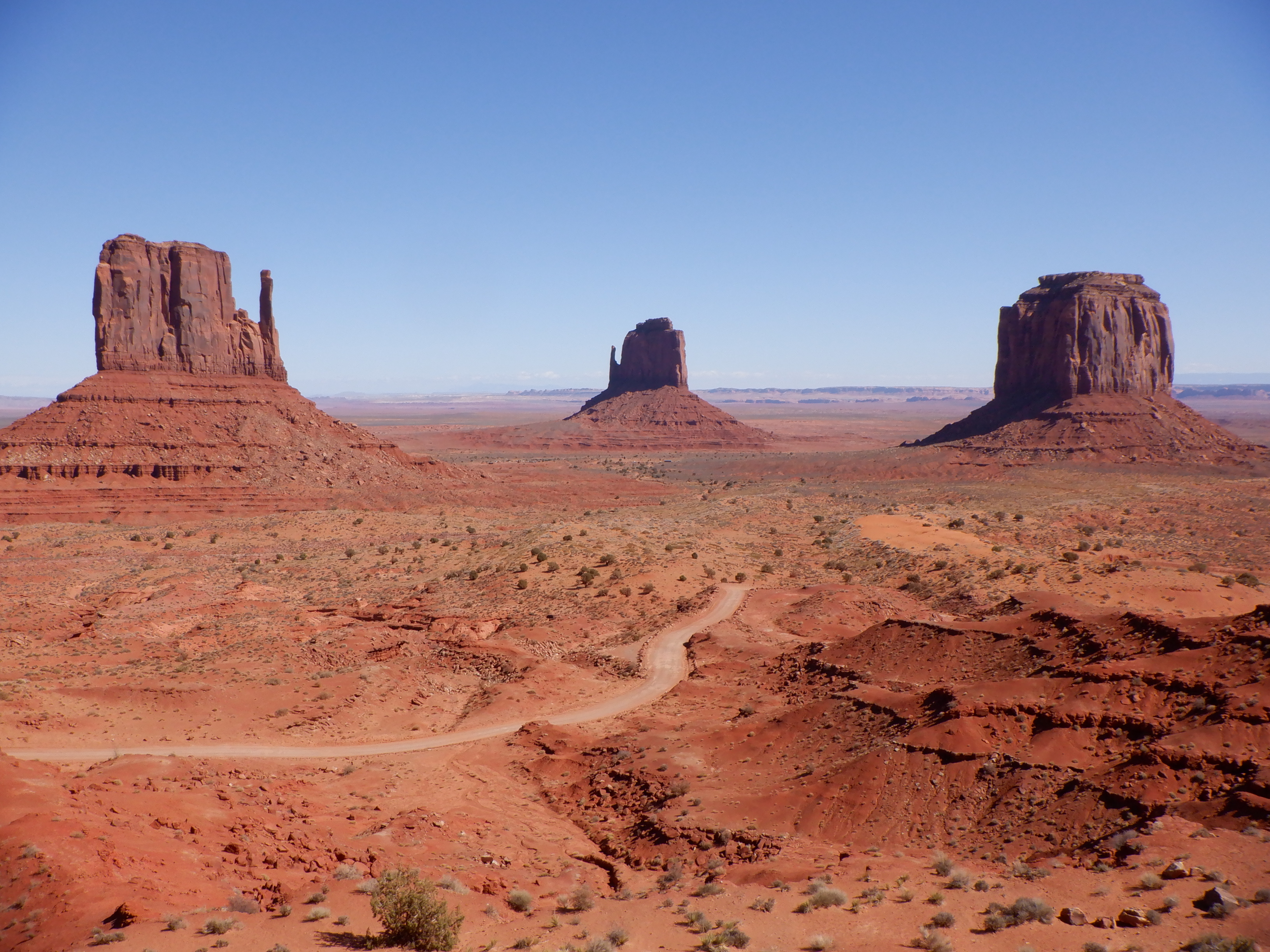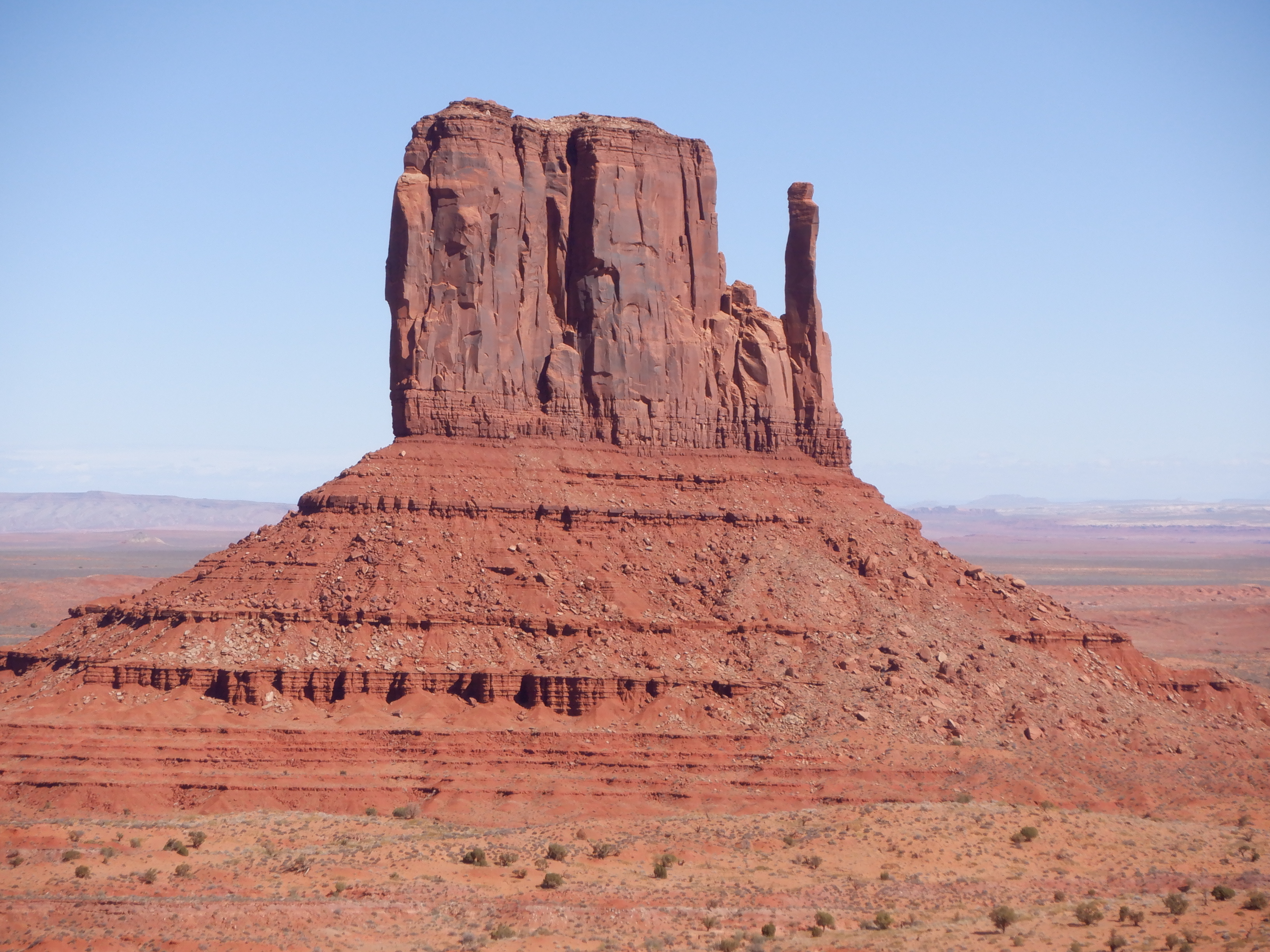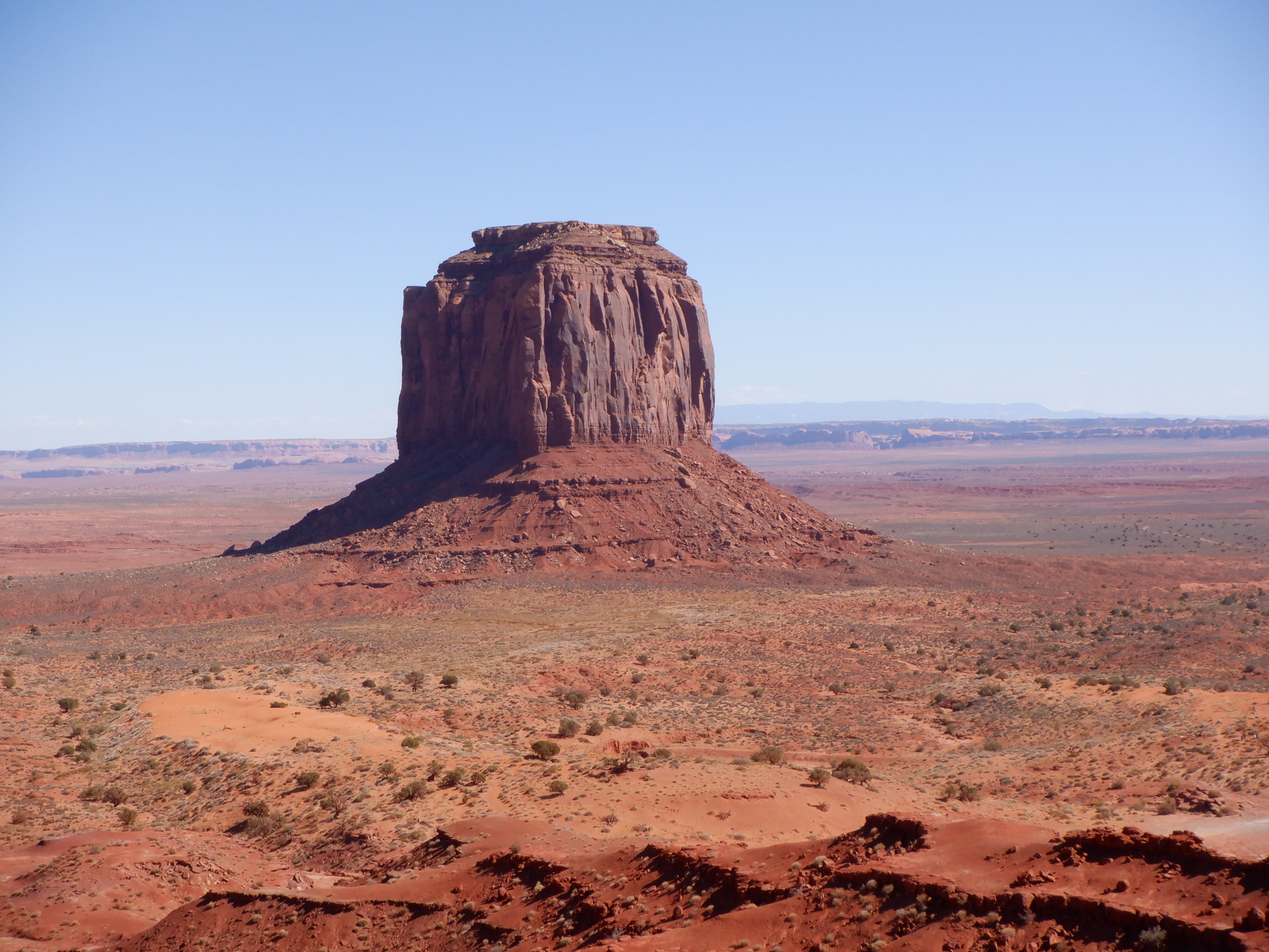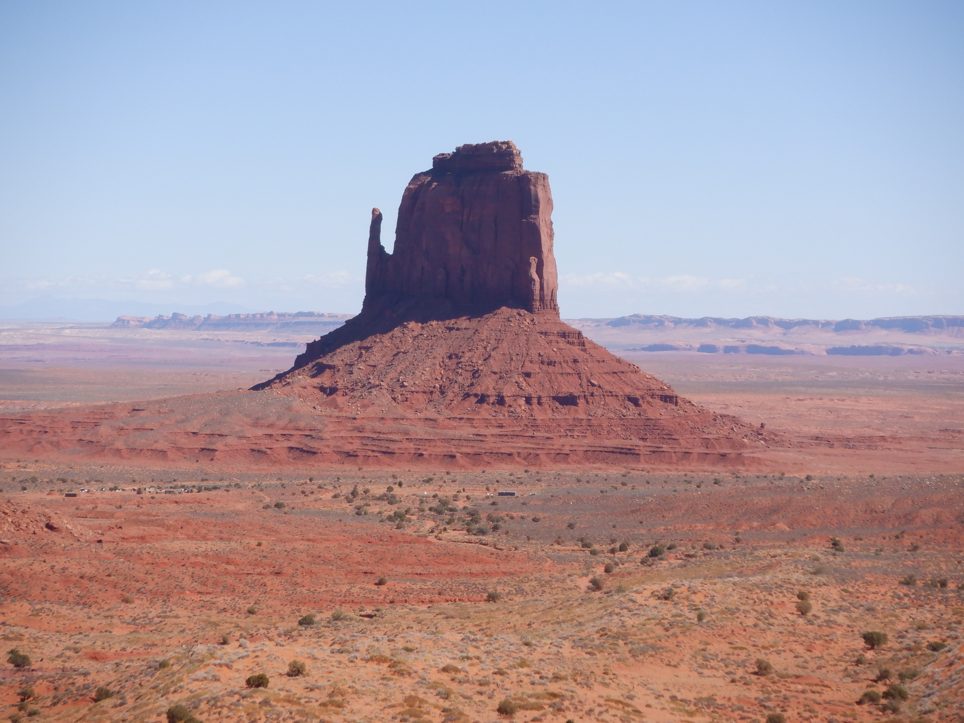 Time for a little geology lesson. These flat-topped mountains are called “buttes” not mesas. A mesa is broader than it is high, an excellent example is Mesa Verde (see earlier blog). A butte is higher than it is wide. The highest of these buttes we can see are about 1000 feet high. The flat top is made by the wind, whereas the rest of the formation is caused by erosion. The very top of the buttes is hard stone while the rest is porous sandstone that is easily eroded by rain. The past several million years of wind and rain have combined to make these hat-like mountains here in Monument Valley. The red color is due to the high iron content of the sandstone.