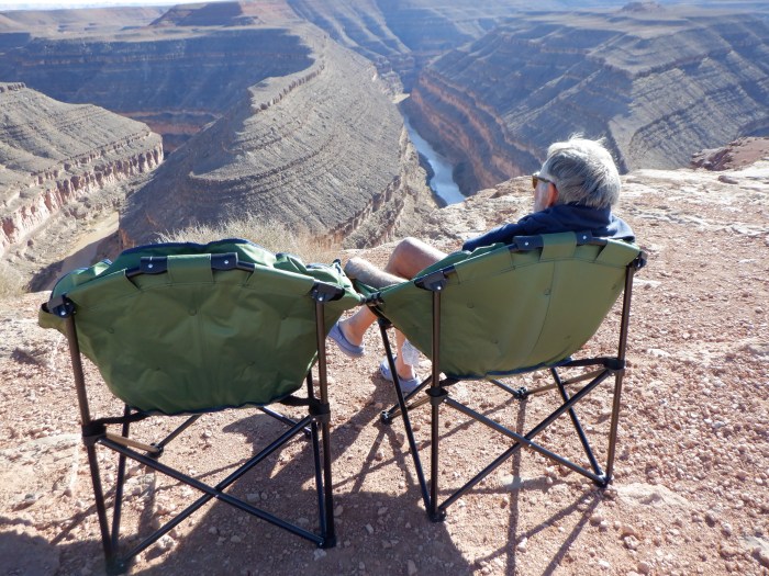 Since we are not spending the night, we need to keep moving and we quickly drove the 60 miles further to Goosenecks of the San Juan State Park where we can camp for the night. This will be another revisit since we also visited here in 1991. This time we will spend the night. The Park Ranger charges us all of $10 per night. There are few campers here and we park Caprise next to a picnic table literally right on the edge of the cliff with the postcard picture view (not too shabby for $10 per night). We will stay here two nights and spend our days trekking along the cliff enjoying the view from many different angles.