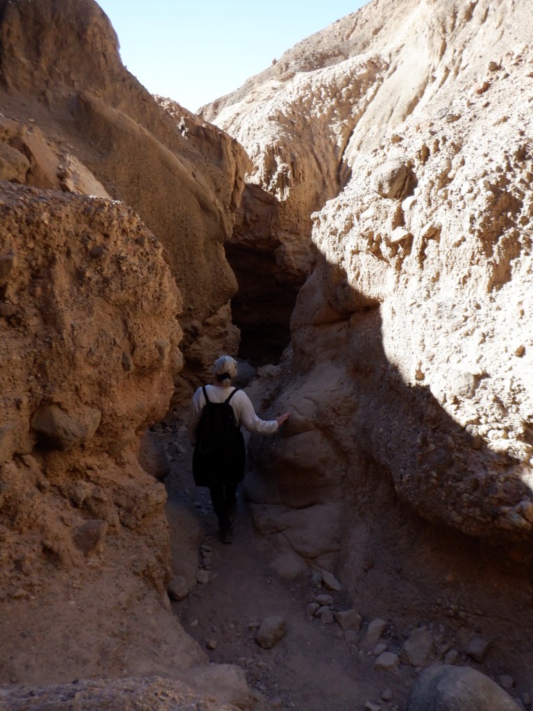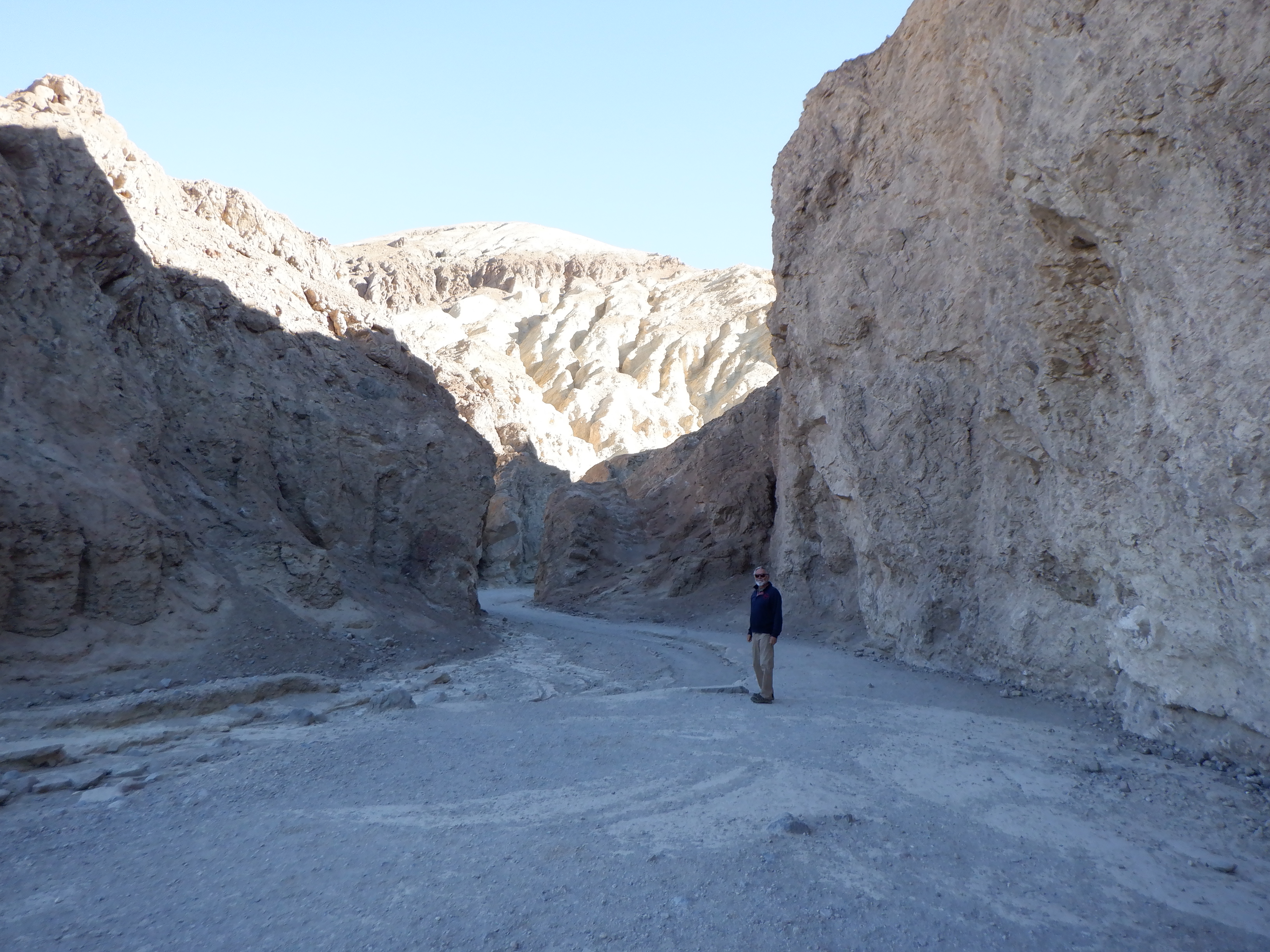 My brother Carl told us, when he heard we were visiting Death Valley, that he visited here once and trekked around. He remembered coming out of one canyon on a trail that ended at the top of a dry waterfall. No way down, he had to edge his way along a cliff for 20 meters of so before the trail began again.