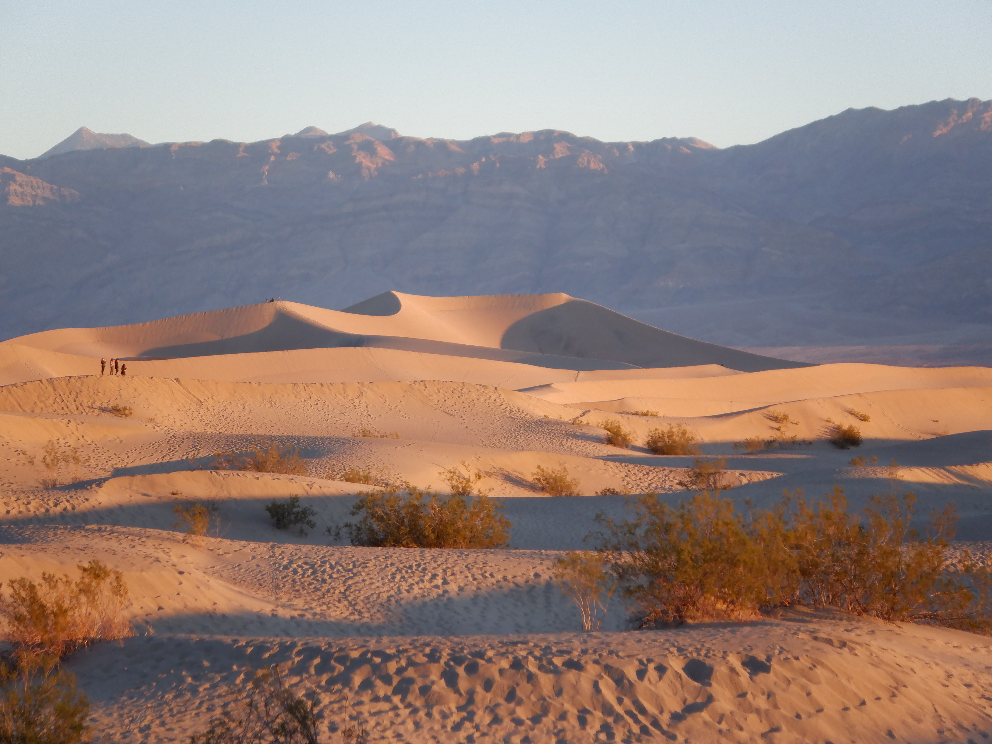 Our time in Death Valley was now approaching its end. In the northern end of the valley is an area known as Mesquite Flats Sand Dunes. It is, as the name implies, an enormous area where the sand blown from across the valley settles. What’s a desert without huge sand dunes? Sunrise, is supposed to be a grand experience, as the morning sun causes long shadows to be raised across the dunes. Ansel Adams, the famous American landscape photographer, took one of his famous pictures here. My picture is, of course, not as good as Ansel Adams’s, but I think it shows just how fantastic this scenery was.