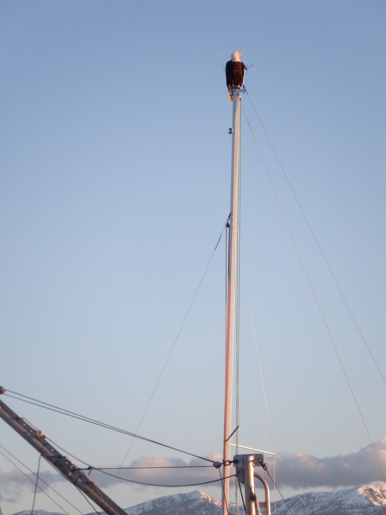 We stayed an extra day due to inclement weather. Up here, inclement means really lousy. But then the sun came out. Sunny, but ungodly cold, with ice on the pier, our decks and cockpit. We bundled up as warm as we can, took in our lines and headed for Discovery Harbor.