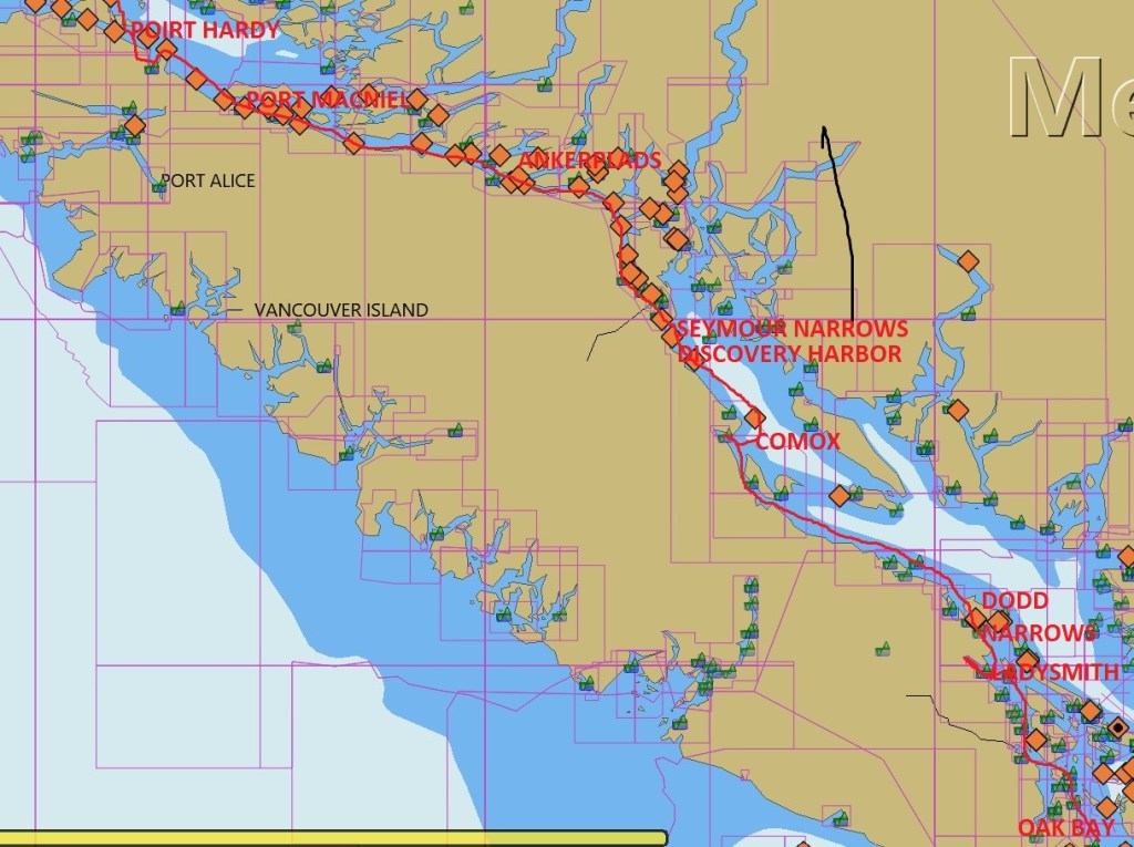 The sail to Ladysmith is utterly fantastic. This is an archipelago chock full of small (and large) islands, reefs and rocks. We slalom between them in the channels, all the while keeping an eye on traffic. Despite these channels being very narrow, there are still large ocean going freighters sailing here. Mostly they are picking up wood, either logs or finished timber. The logging industry is a major industry up here. Vinni, our navigator, has studied the tidal currents so we sneak through Samsun Channel at slack water. An added bonus, there is no wind making this passage a simple one. It can be a hell though. Katabatic winds fall off the heights around us and if you timed your passage wrong the currents can six knots or even more, creating impossible maelstroms.