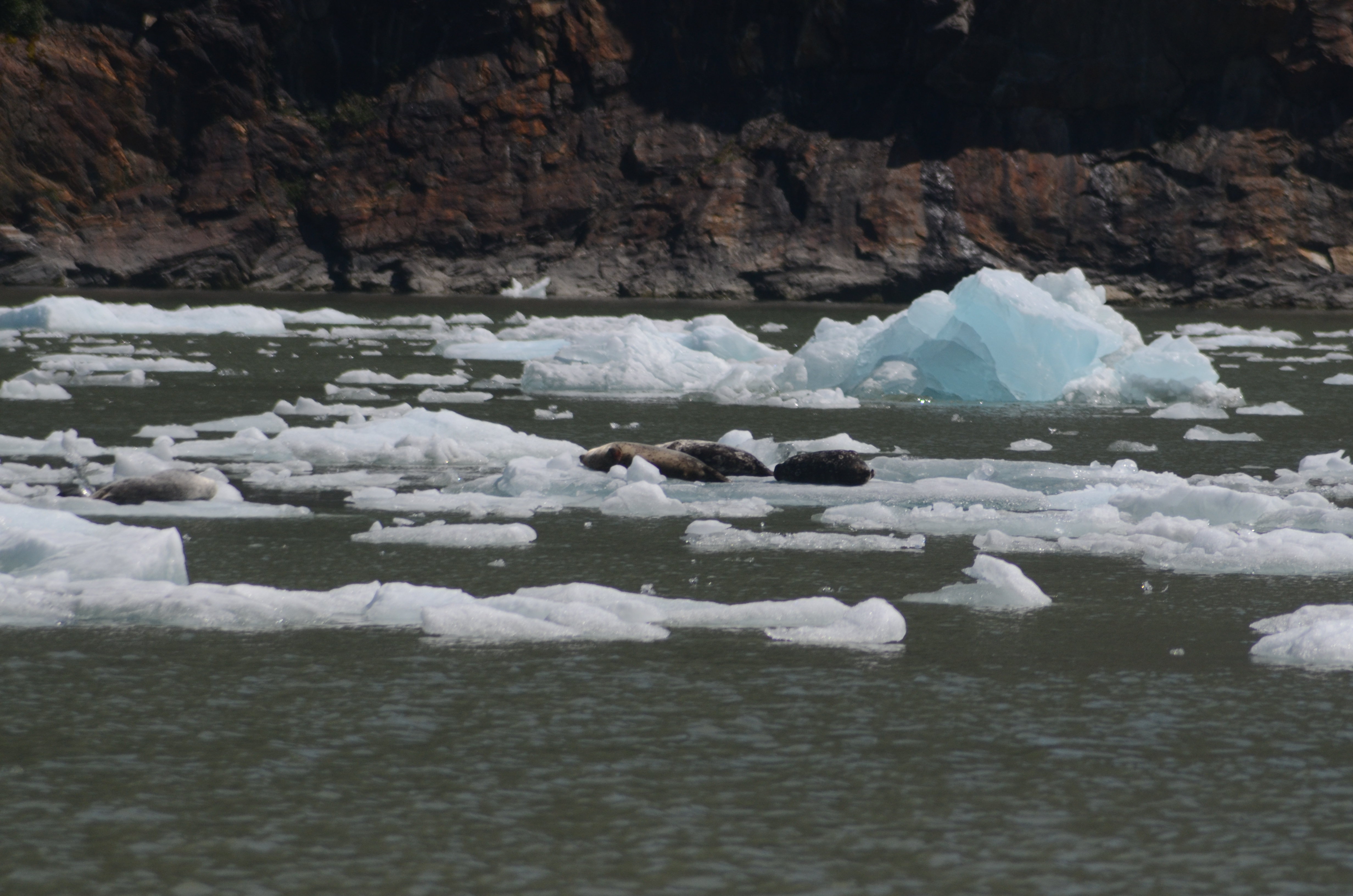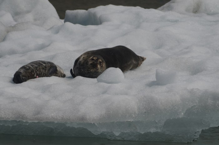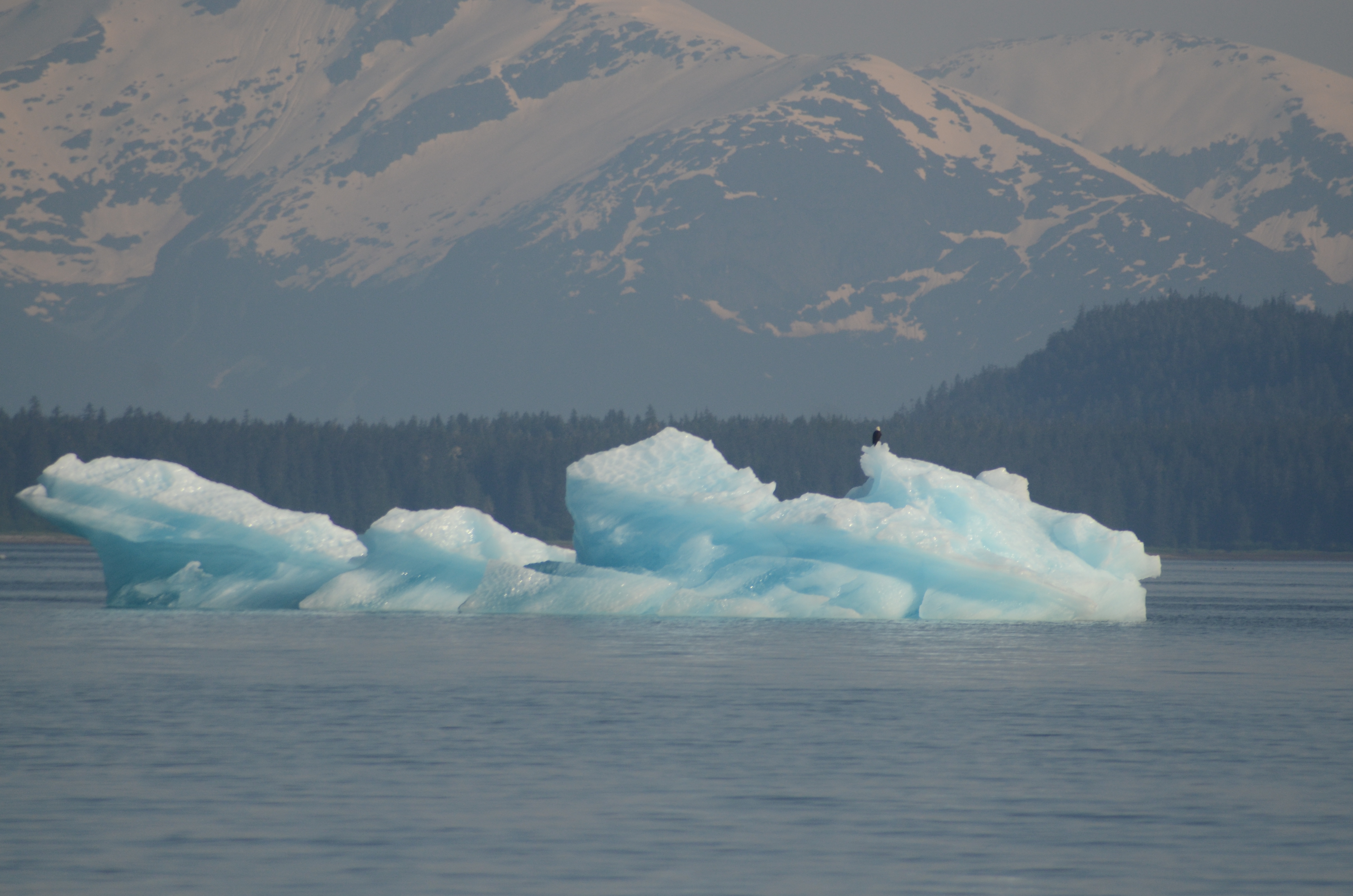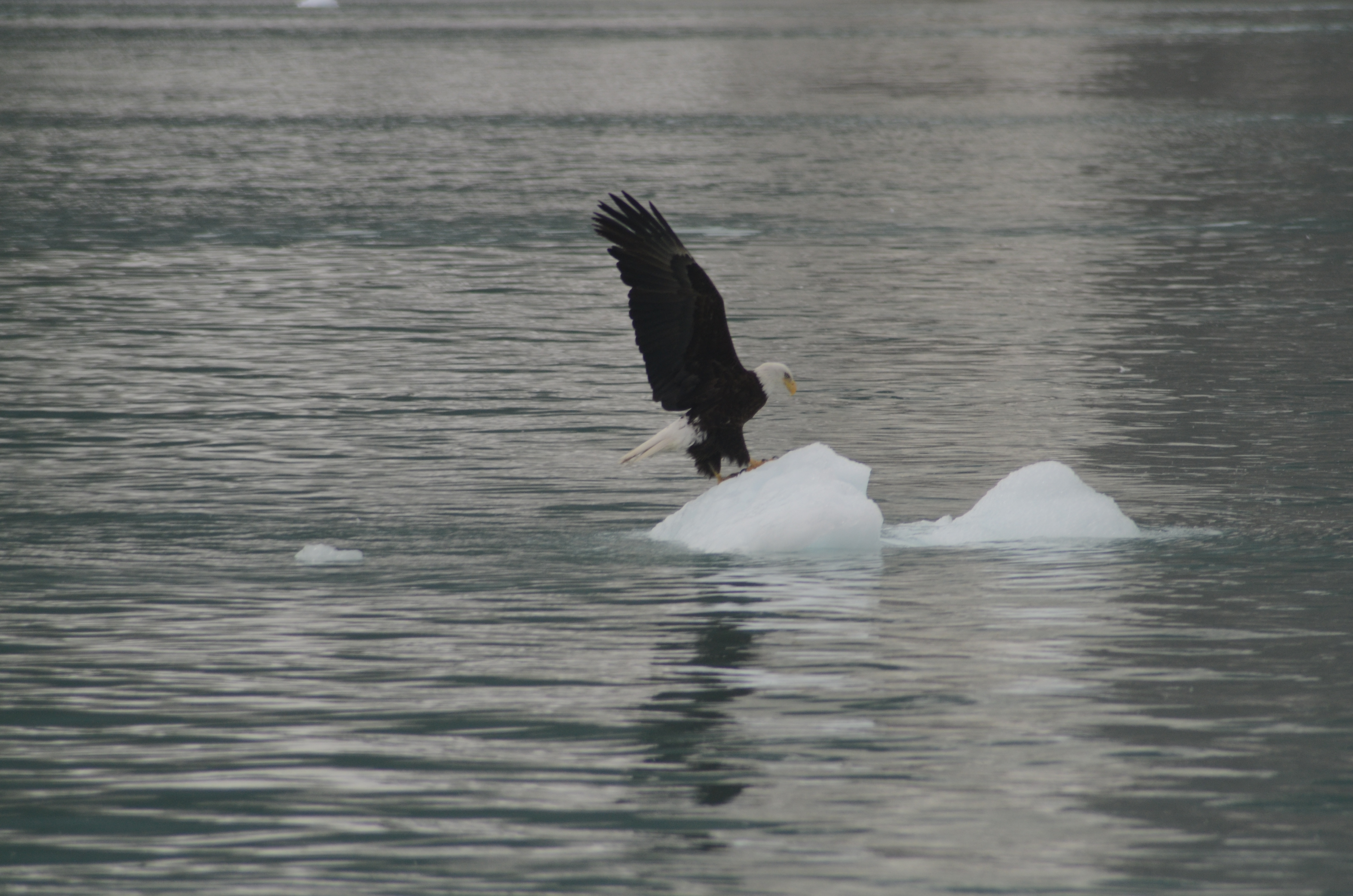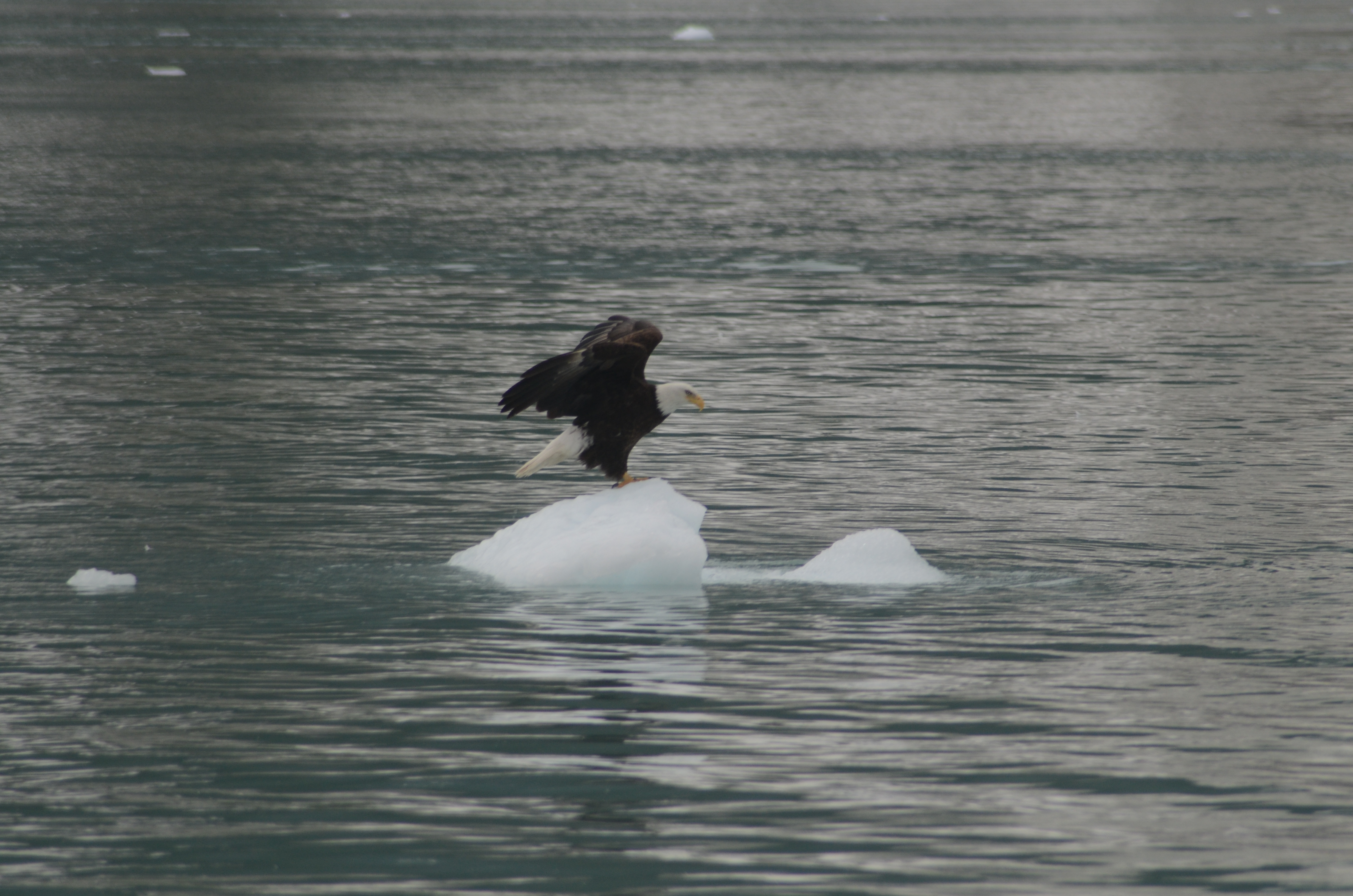 Seal mothers and their pups occupied many of the floes. You have to be careful not to disturb them. If the mother gets nervous or afraid, she may dive off the floe leaving the pup behind. Then the pup and mother can’t find each other again and the pup will die. We see many mothers and their newborn pups lying on floes. Sea otters also abound here. We see them everywhere, swimming along on their backs while they eat a fish or just sunning themselves. Vinni is totally in love with them – they are cute. Bald Eagles soar over us everywhere, sometimes they settle on an iceberg. Bald Eagles may be an endangered species in the lower 48, but up here there are thousands of them – the best guess is somewhere over 30,000.