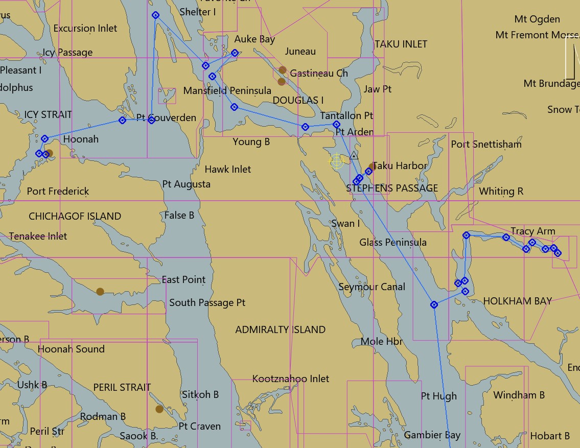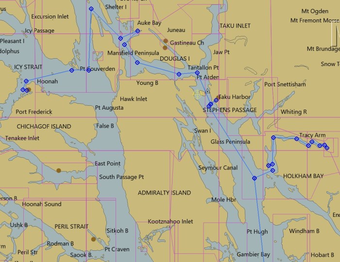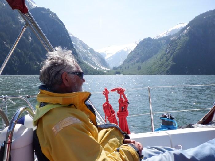 Phew. The adrenalin is still pumping around in our bodies as we turn our bows northward. We want to reach Juneau this evening, but we have a “bailout” in place if something should happen.