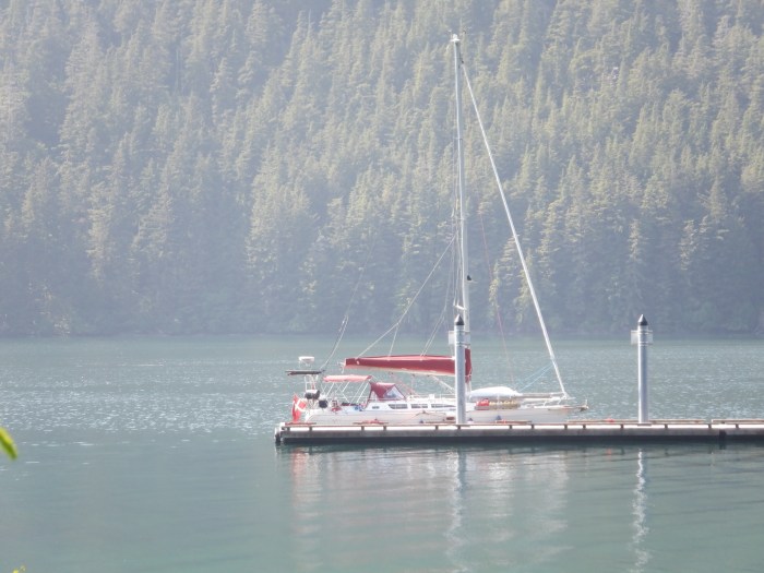 Neither our Pilot book nor our charts have much to say about Taku Bay. There, supposedly, is an old fisherman’s pier which we are sure is broken down. But the Pilot book notes that the bay is a protected anchorage with good holding so we’re sure we will be happy. As we reach the bottom of the bay, we see four boats tied up at a brand new dock. They inform us that the dock is a Juneau city dock and is free to use. What a happy surprise.