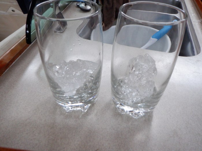 They have their dinghy in the water and David rows by and knocks. He has been out chipping ice off an iceberg for their before dinner drinks and do we want a big bag of glacier ice? Of course we do. G&T’s can’t get more high class than when they are made with ice that is over 10,000 years old.