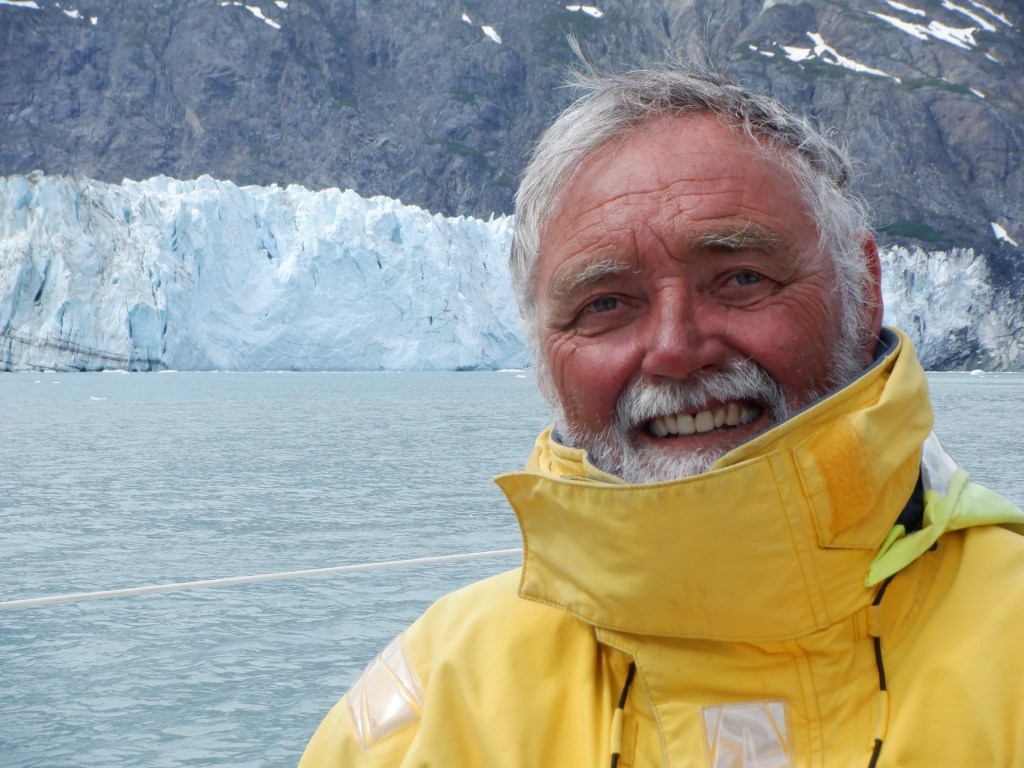 While Carsten is in the dinghy, several large “thunderclaps” sound and Margerie calves small bergs into the water. I kept a sharp lookout for waves in case I need to rescue Carsten in a hurry. He won’t last long in these icy waters if he capsizes. He is understandably also nervous and says, “let’s get the hell out of here” as soon as he is back on board. We didn’t take a selfie in front of the glacier – but I did take a picture of Carsten.