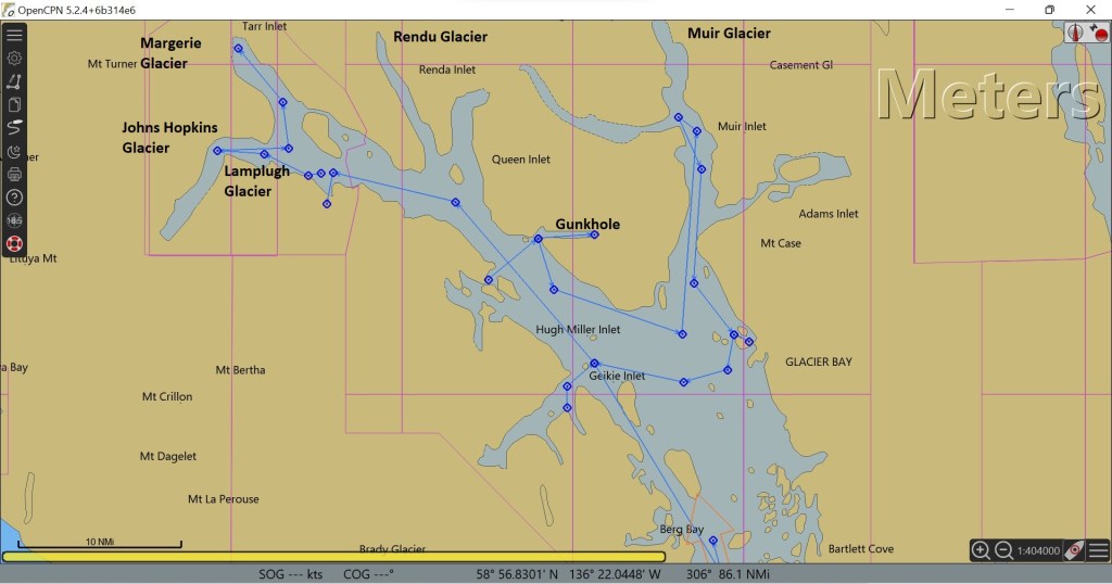 We spent last evening talking about our vagabond lives. We realized when we made the turn at Margerie Glacier that it signified the farthest point of our journey. It was the turning point. Hereinafter, all the miles we put under our keel will be miles heading back to Denmark. Until now, the miles have all been heading outward bound – now they are homeward bound. Oh, it will take us a couple of years (maybe more) before we are back in Denmark and there will be swings and roundabouts on the way, but we’ve made the decision.