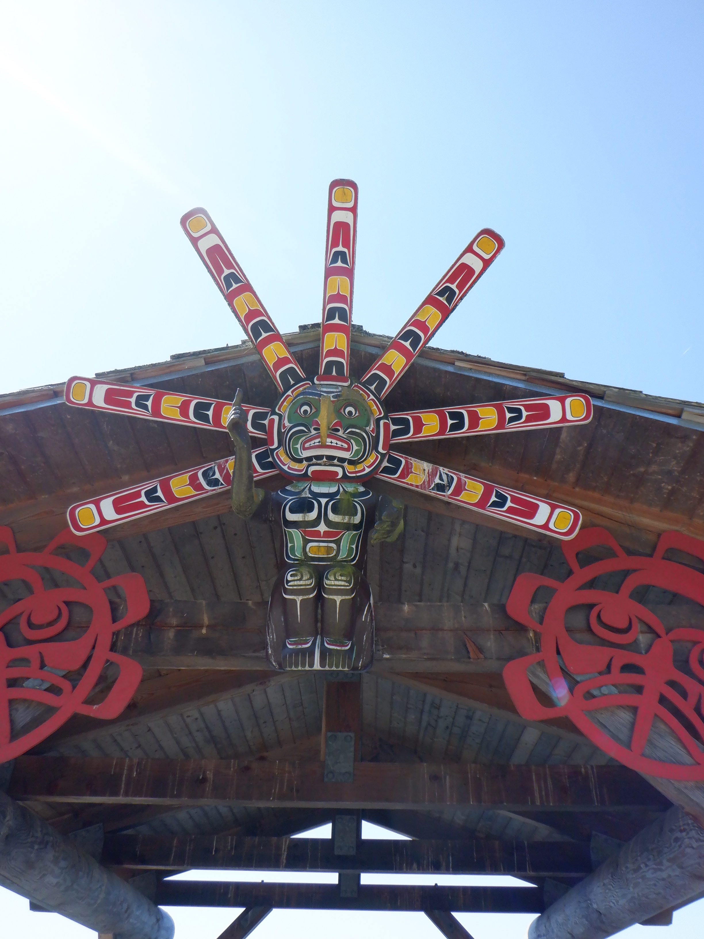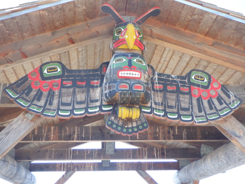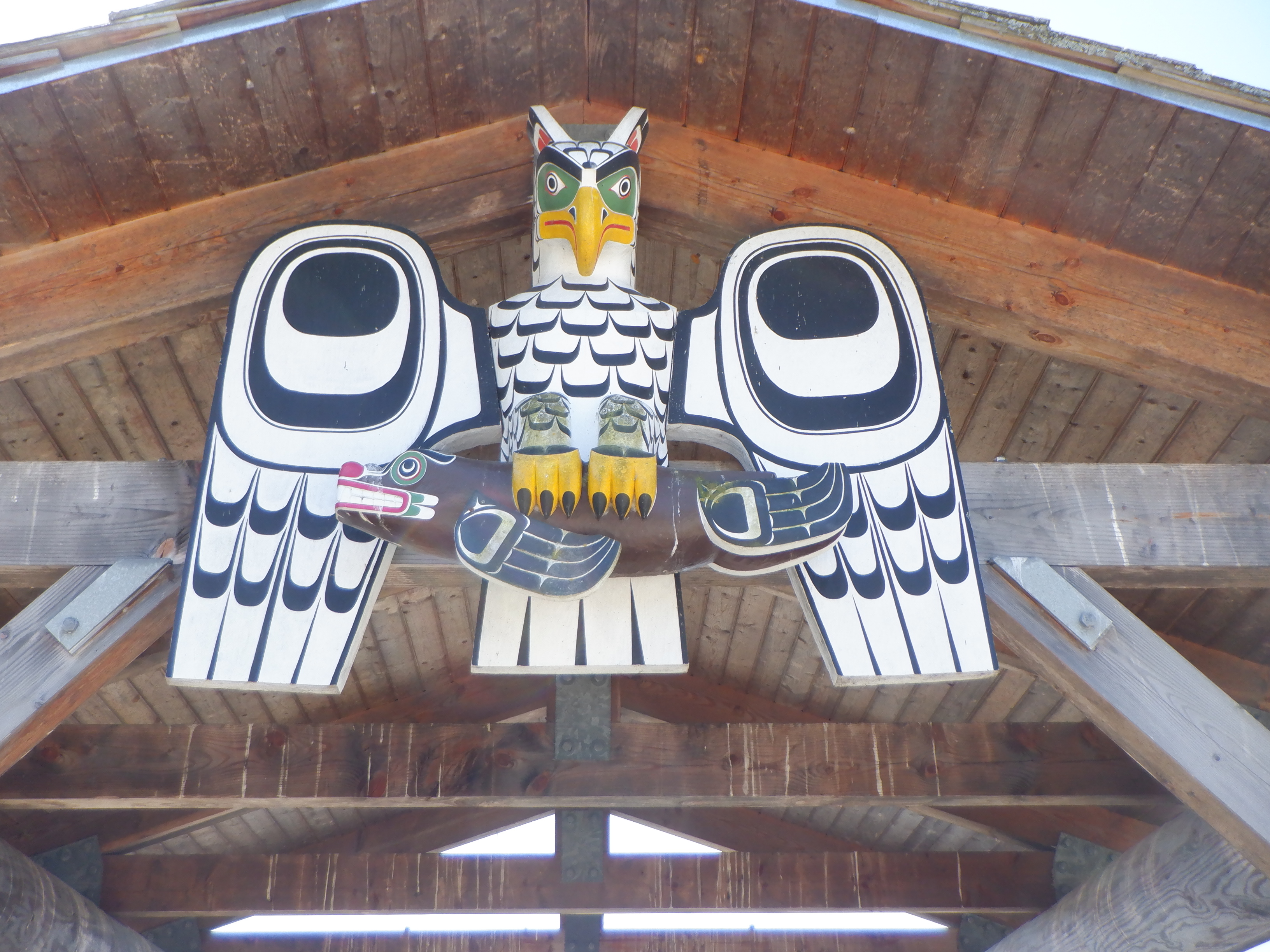 Along the coast of Alert Bay, there are five small pavilions. Each building is adorned with a carving of an animal. These are called Awakwas and symbolize the forefathers of each of the five ‘Namgis clans, known collectively as ‘Na’mina.