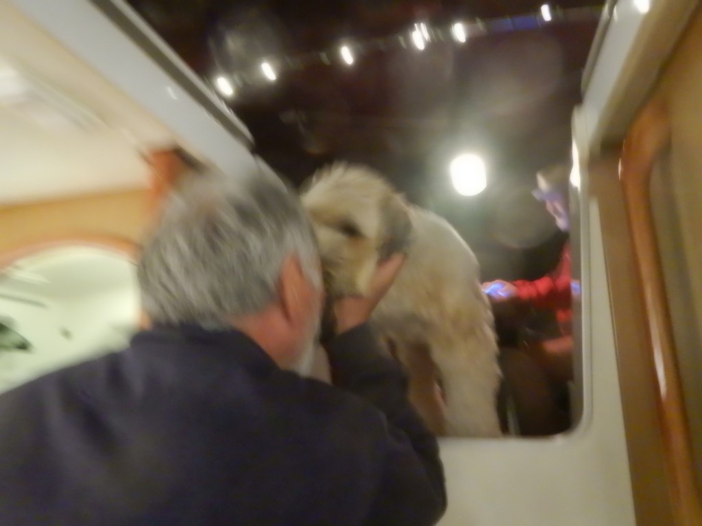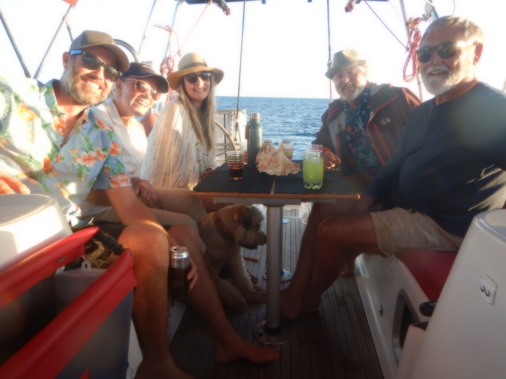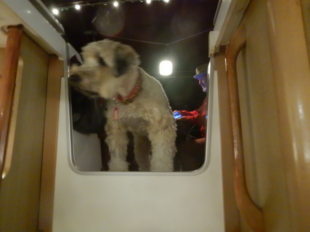 Caroline and Chad from Wild Blue have brought their entire lives with them on the boat. They have lived on boats for the past eighteen years, but only cruised for the past two. Vinni and I are impressed with just how much they are carrying. The deck and roof over the saloon are filled with all kinds of things. There are “things” everywhere down below, but it is cozy and truly a home. Their seventeen year old cat lives with them and so does their 4 year old dog, Spinnaker. Spinnaker has lived his entire life on the boat so he knows no other existence. He is an unbelievably sweet and happy dog. When visitors come, he jumps around, dancing and yipping and gets so excited that he does not know if he is coming or going.