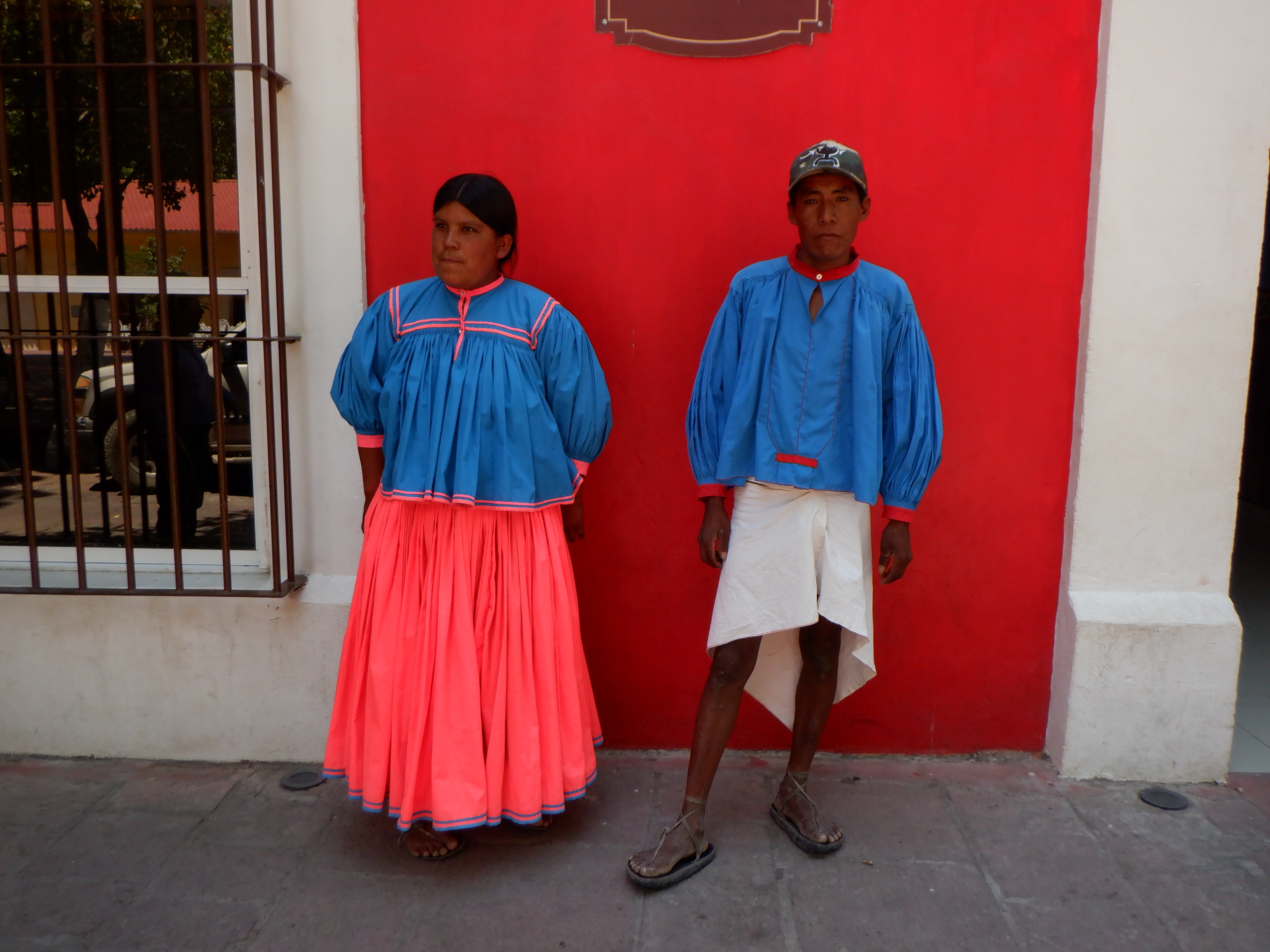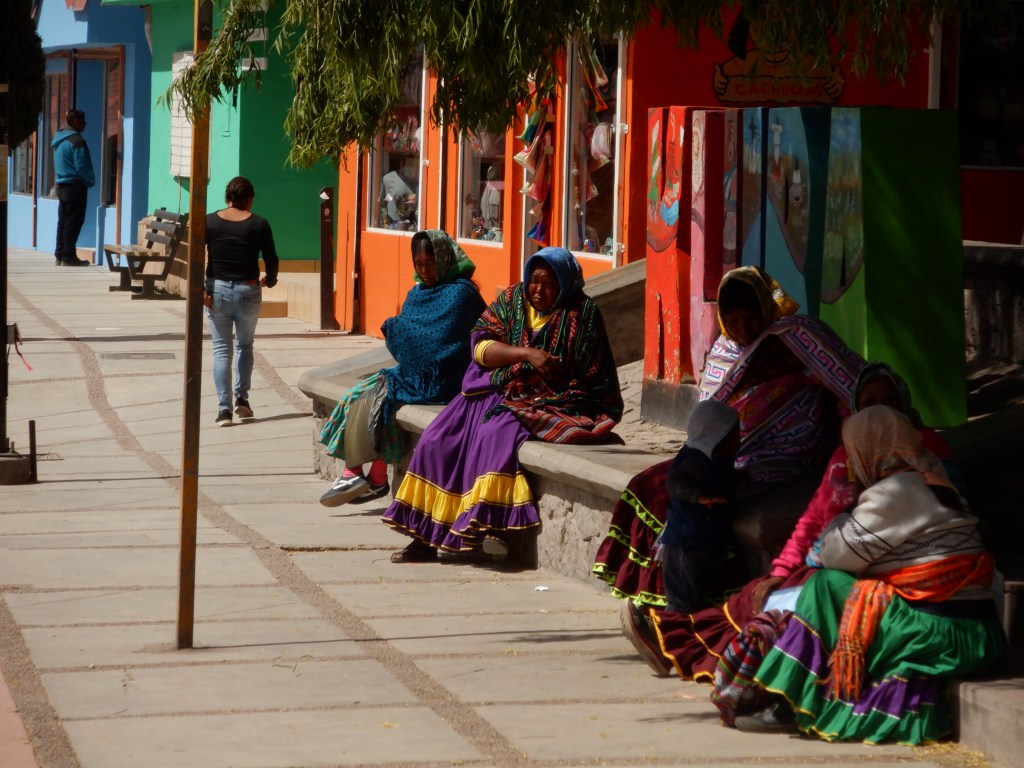 Here in Batopilas we see the same colorfully dressed Tarahumara. The women are in fancy long dresses, the men still wear a loincloth with their shirts. Shoes are the huaraches, sandlas made of old tires.