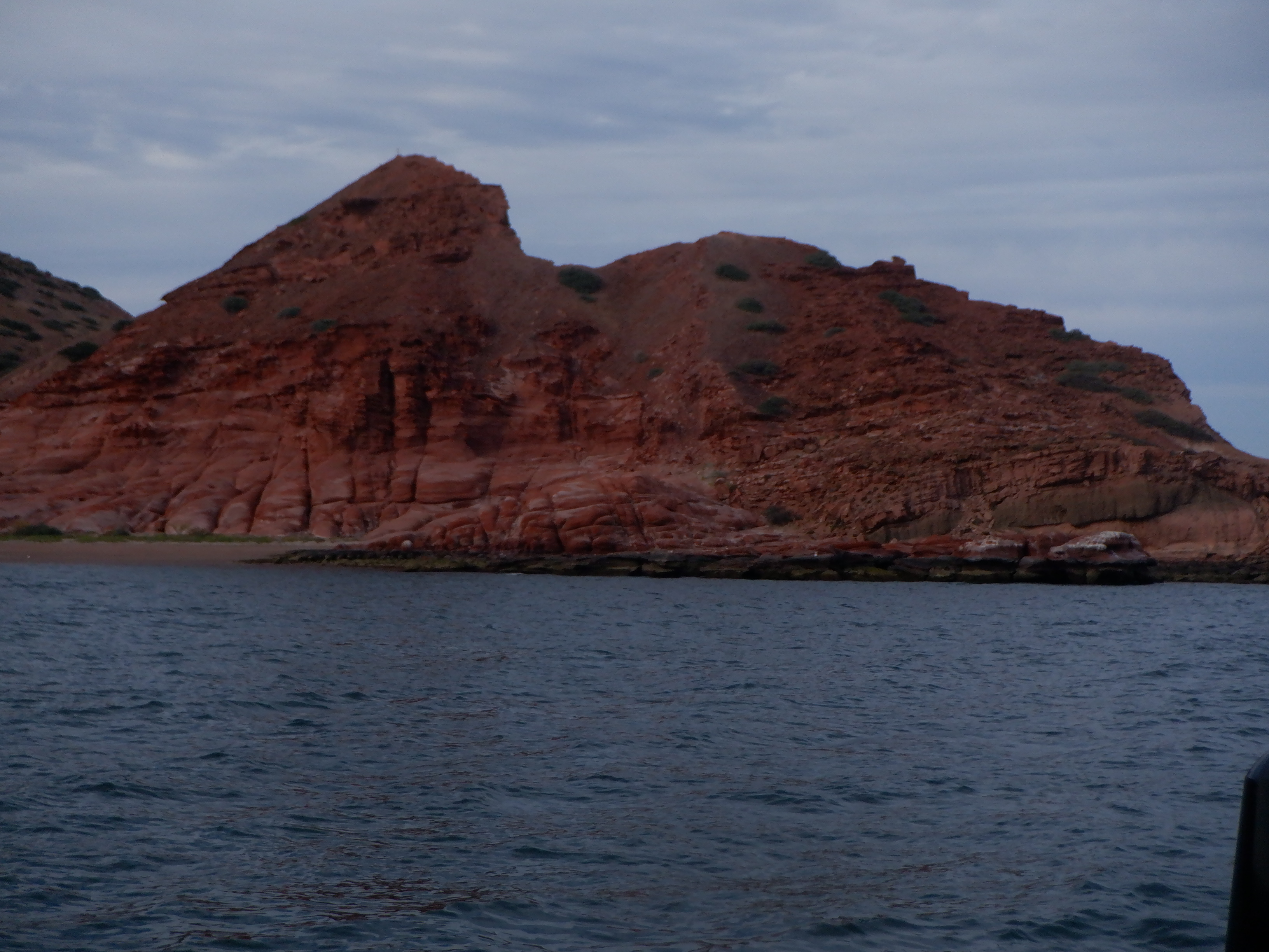 After a few days here, we set sail for Bahia Los Gatos. Gatos means cats in Spanish and legend has it that a family of jaguars set up housekeeping in a cave by the beach many years ago, and the locals have been calling it Bahia Los Gatos ever since. Los Gatos other claim to fame are the deep red cliffs that surround it. At eventide, the setting sun turns them blood red.