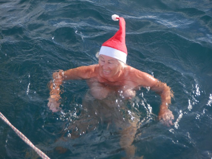 Christmas Eve dinner was a leg of lamb we purchased on Grenada. Better to call it mutton – it was tough and not tasty. But the wine and the ambiance was good. Our tiny Christmas tree sparkled and the Christmas spirit descended on Capri.