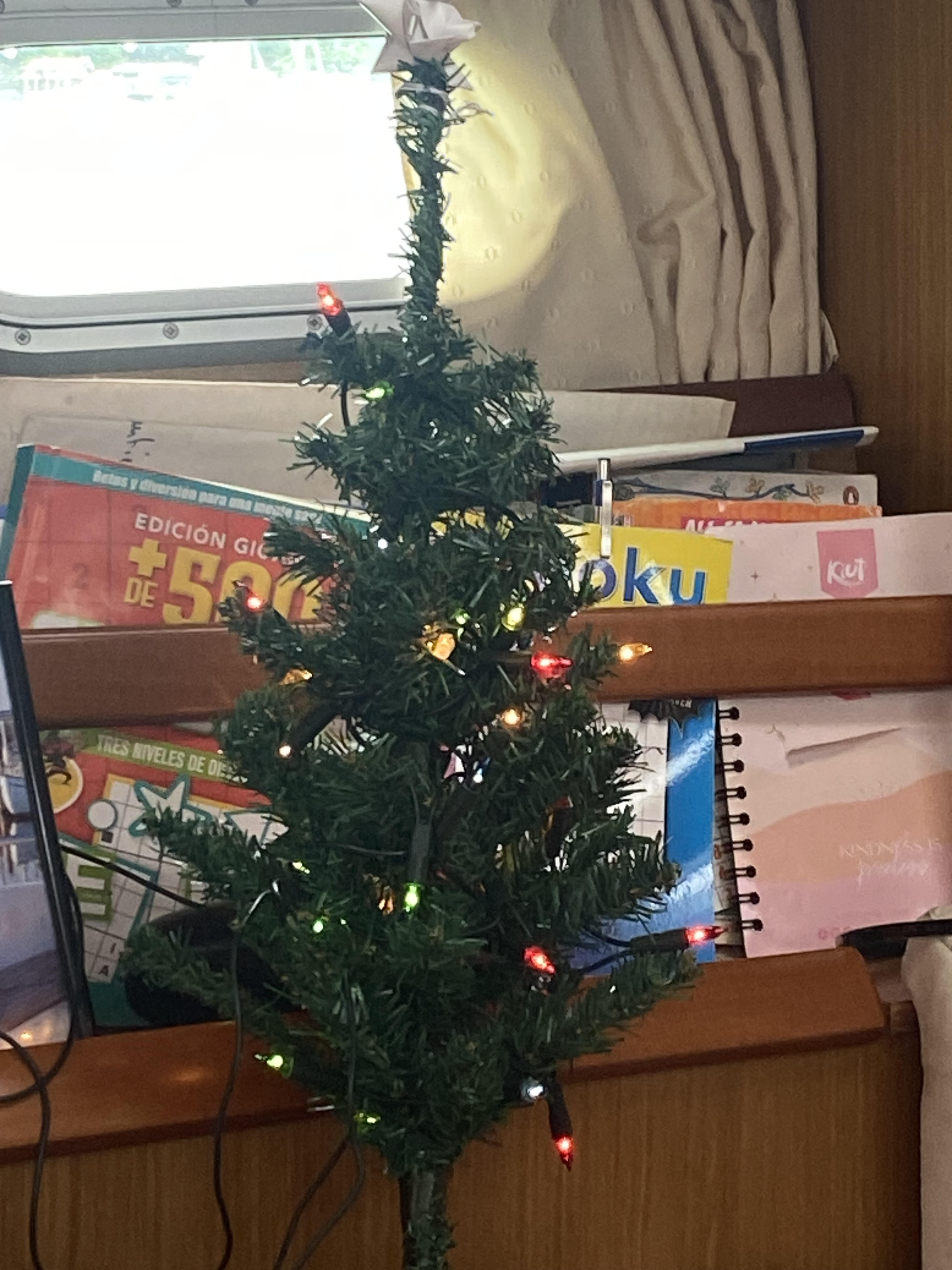 Christmas Eve dinner was a leg of lamb we purchased on Grenada. Better to call it mutton – it was tough and not tasty. But the wine and the ambiance was good. Our tiny Christmas tree sparkled and the Christmas spirit descended on Capri.