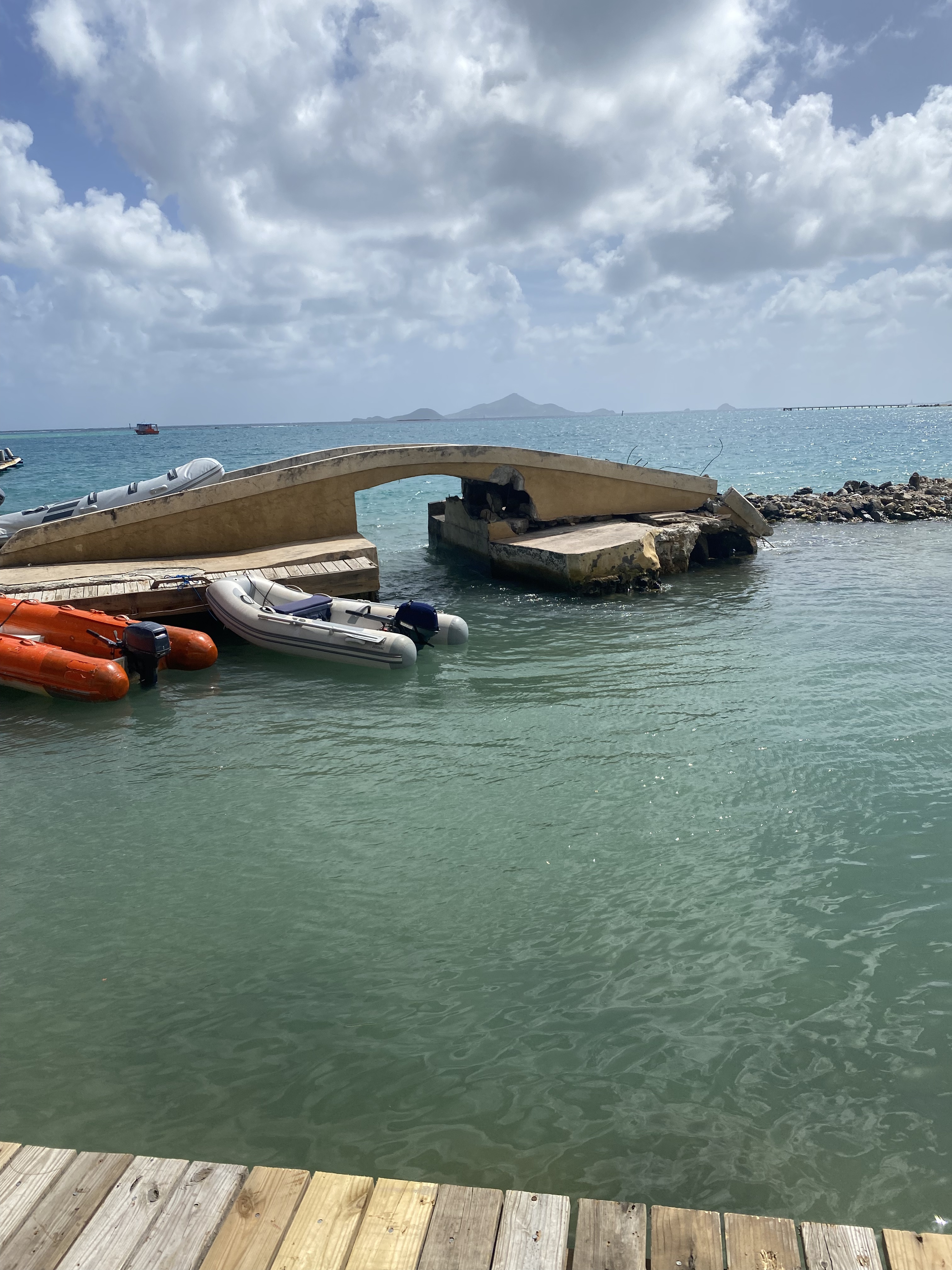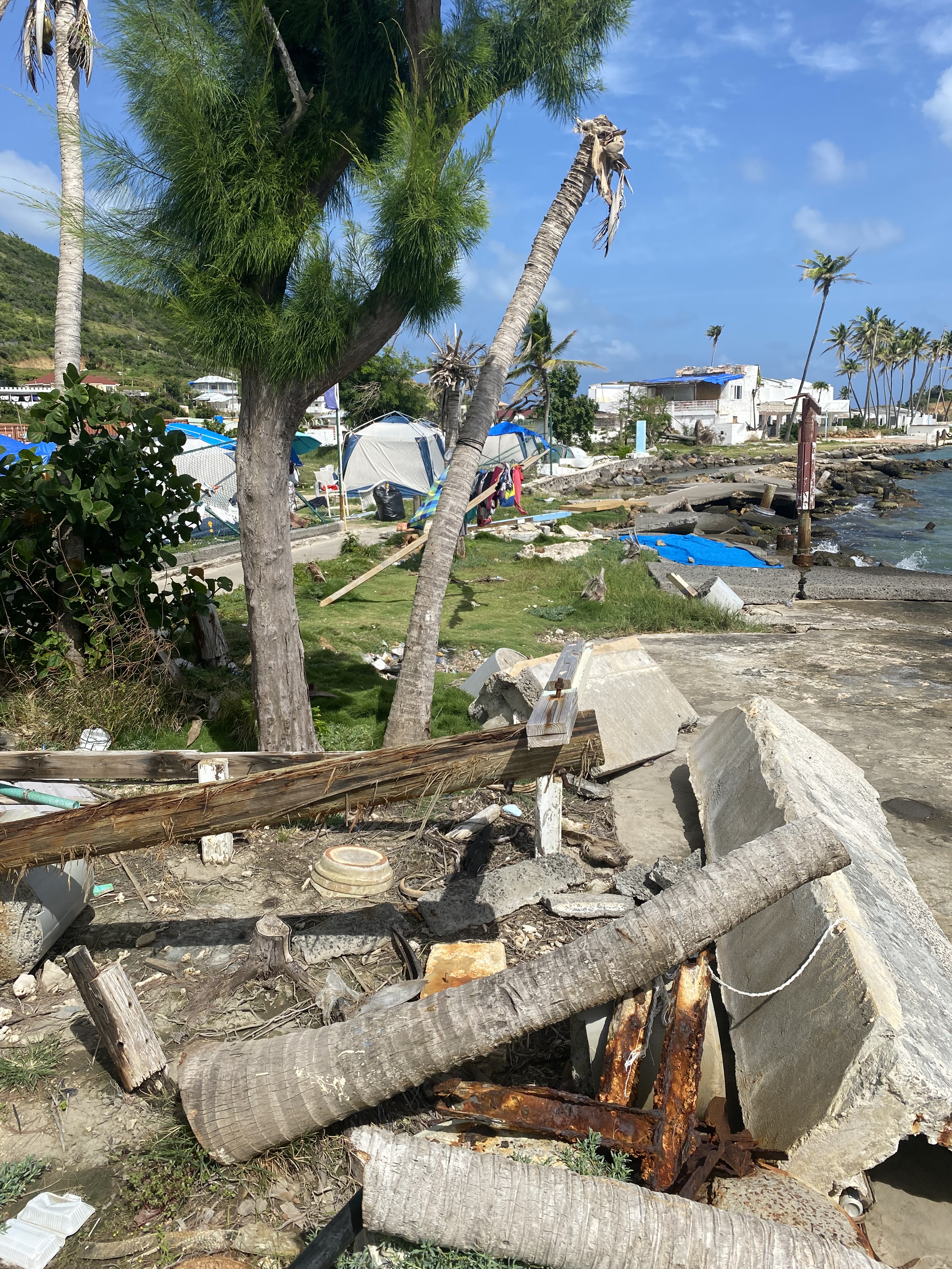 Down by the harbor, there was a tent city, occupied by those whose houses had been completely destroyed. At the town square (what was left of it), there was a soup kitchen, doling out meals three times a day. The wonderfully charming dinghy harbor was no more. The lay behind a concrete seawall and entrance was gained by sailing the dinghy under a raised bridge. Once inside, there was a long wooden dock and a (lively) bar. Next to the bar was a small Italian restaurant where Vinni and I had the best tuna carpaccio we have ever experienced. Everything is gone. The bar walls still stood and a tiny portion of the roof. The little Italian restaurant was gone – only a pile of bricks and wooden poles lay helter-skelter on the grounds. The charming little bridge we sailed under was still there, but the water surge had broken the concrete and moved the bridge to one side. Everything needs to be rebuilt.