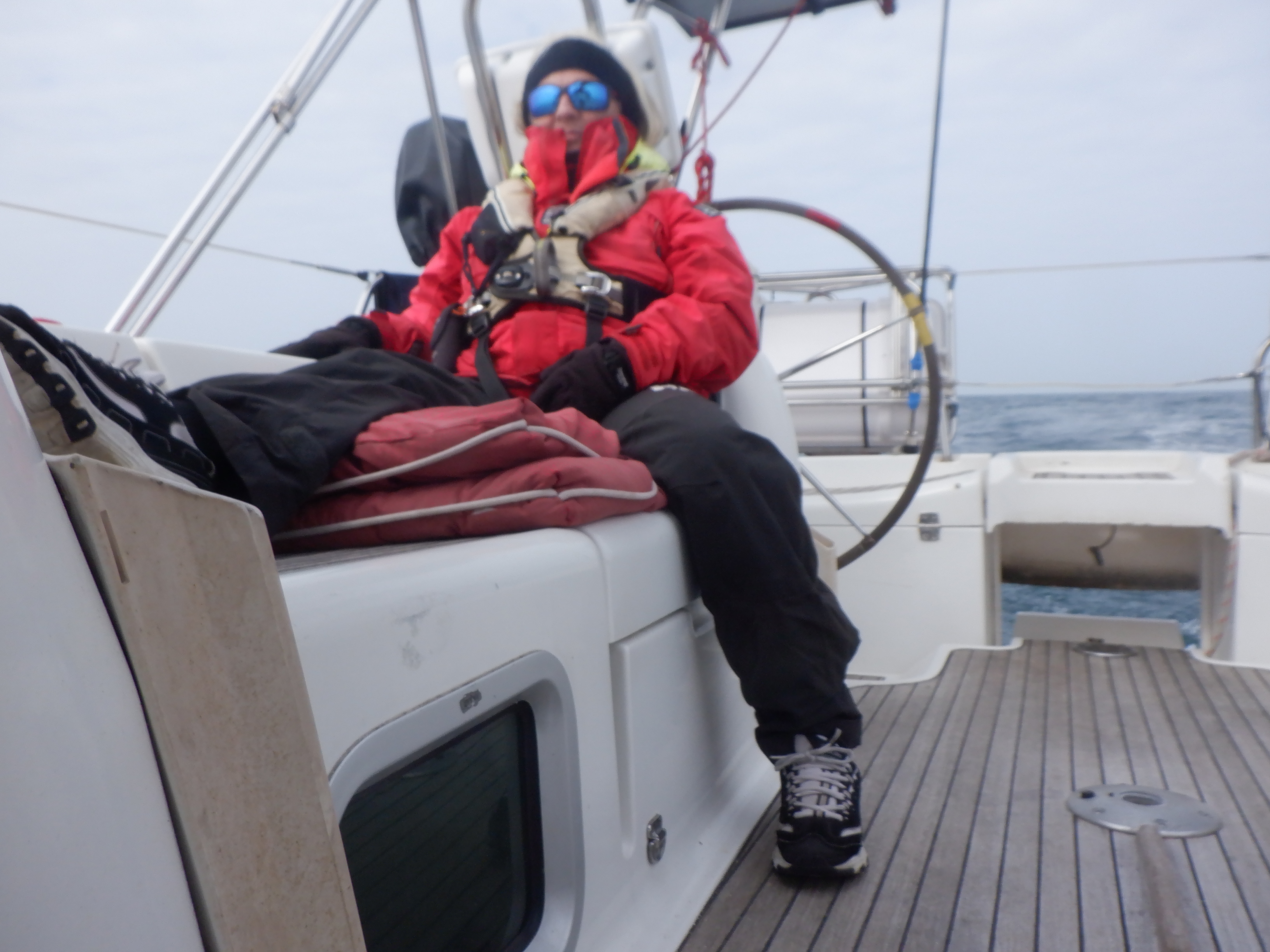 I have to admit that I was both nervous and stressed when we sailed down the River Hamble. We only met two cruise ships coming the other way, so it wasn’t the ship traffic, but rather the multitude of buoys and lights blinking from all sides was confusing. Carsten had the helm and did a fine job navigating this “ocean of lights”.