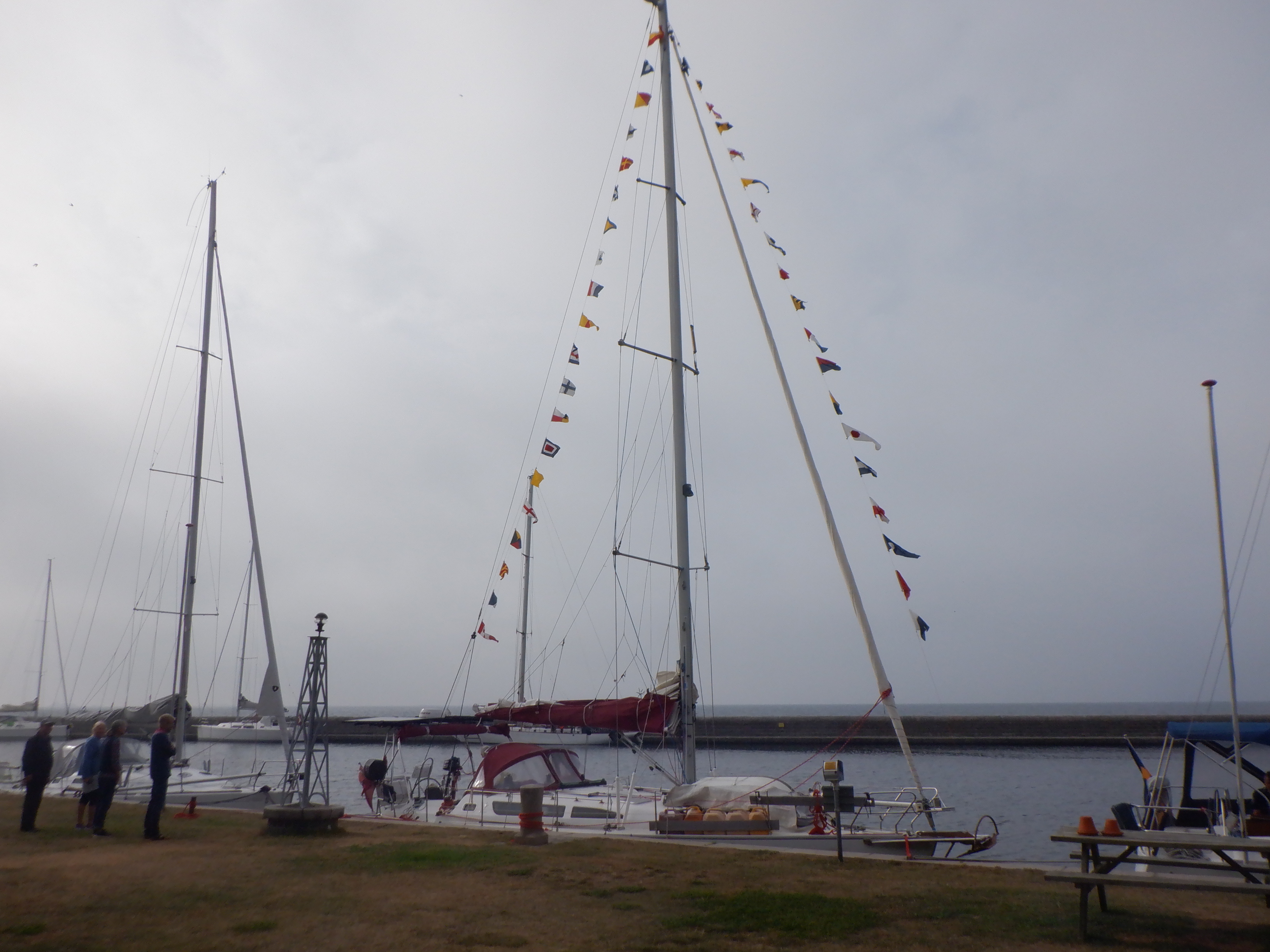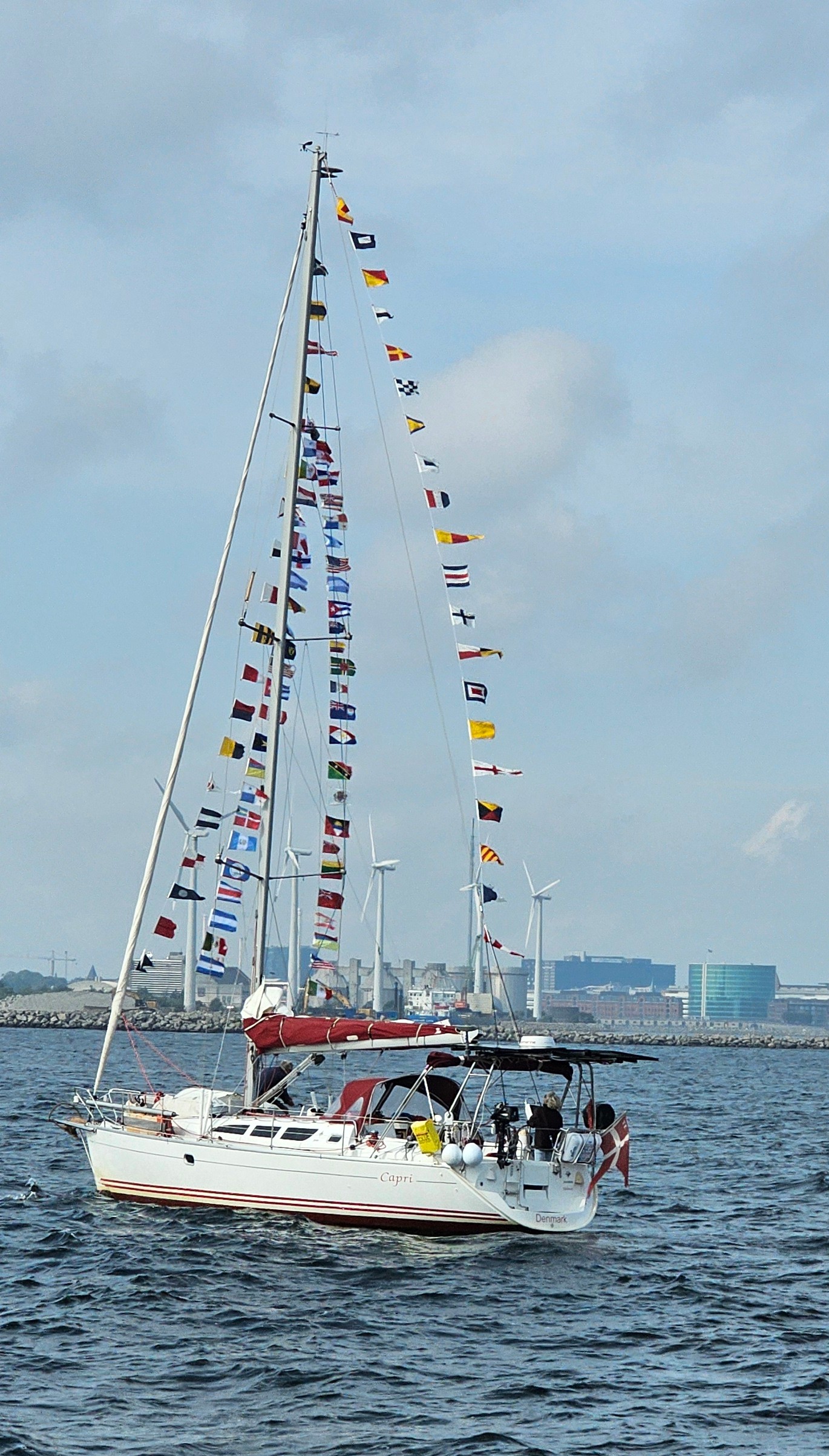 We spent a couple of nights on Flakfortet, a small island just off Copenhagen.  Partly because we needed to get Capri ready for the big homecoming.  She needed to “dress ship”, meaning have all her signal flags flying from bow to stern and all our courtesy flags flying from port to starboard.  A courtesy flag is a small flag you fly when you make landfall in a foreign country. It is that country’s national flag.  And we had invited everyone to the dock at 12:00 sharp saying we would dock exactly at noon.